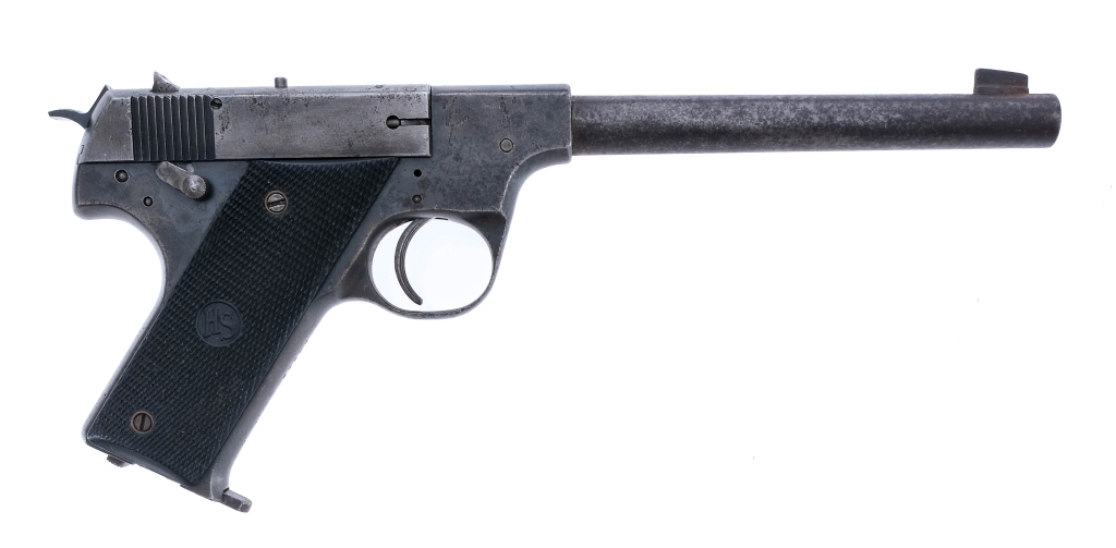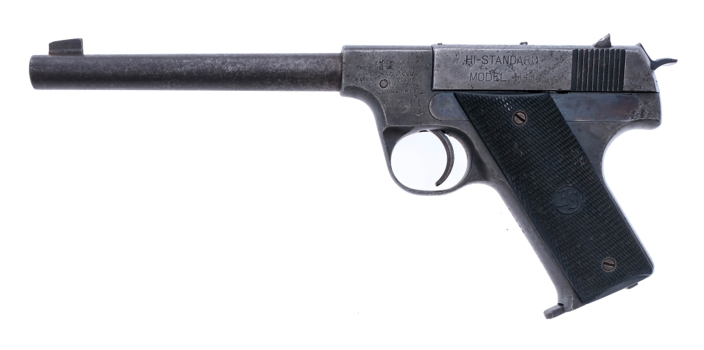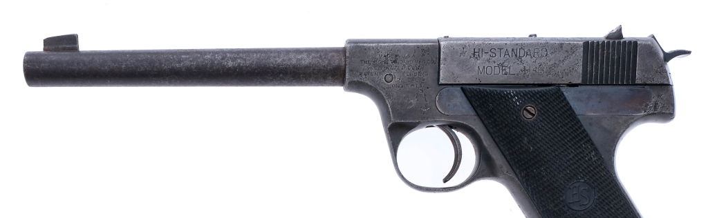 Description High Standard Model H-B in .22 Long Rifle with one, ten round capacity and a 6.75″ barrel. Checkered composite grip plates. Finish worn blued frame, serrated trigger, hammer, serrated slide and barrel. Magwell located serrated magazine release. Right side of frame take-down lever. Rear notch and front fixed blade sight. Must ship to a C&R or FFL holder. Condition: Poor with scratches, finish wear/loss, rust/pitting and handling wear. The slide action is sticky and needs cleaning. Clean rifled bore. Barrel Length: 6.75″ Serial: 57645 Manufacturer: Hi Standard Year: 1940 Caliber: .22 LR Model: H-B Book# 05647