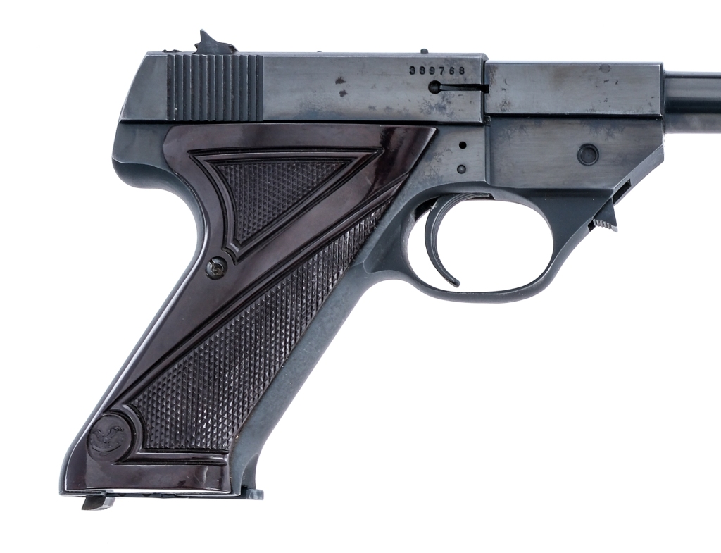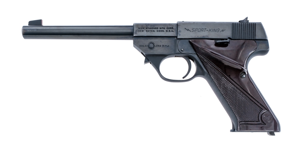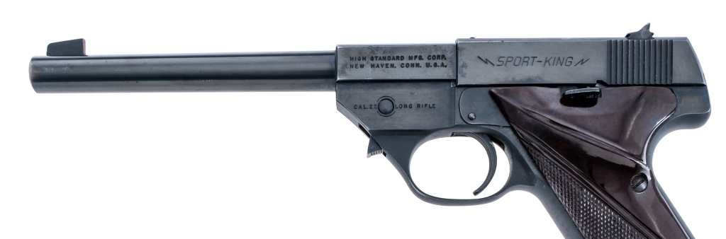 Description High Standard Sport King in .22 Long Rifle with one, ten round removable magazine and a 6.5″ barrel. Made in New Haven Connecticut in 1952. Checkered brown composite grip plates. Blued serrated trigger, frame, serrated slide and barrel. Magwell located serrated magazine release. Left side of frame serrated safety switch. Front underside of frame located serrated barrel release, allowing you to change barrel lengths. Must ship to a C&R or FFL holder. Condition: Good with light scratches, muzzle wear and small spots of rust. Clean rifled bore. Barrel Length: 6.5″ Serial: 389768 Manufacturer: High Standard Hi-Standard Year: 1952 Caliber: .22 LR Model: Sport King Book# 05660