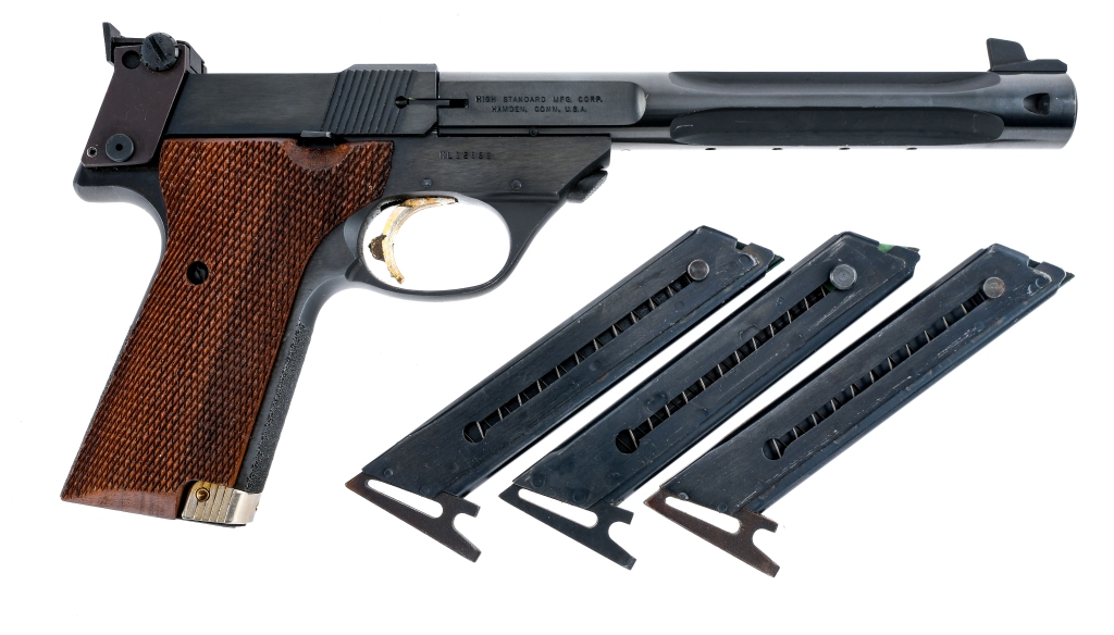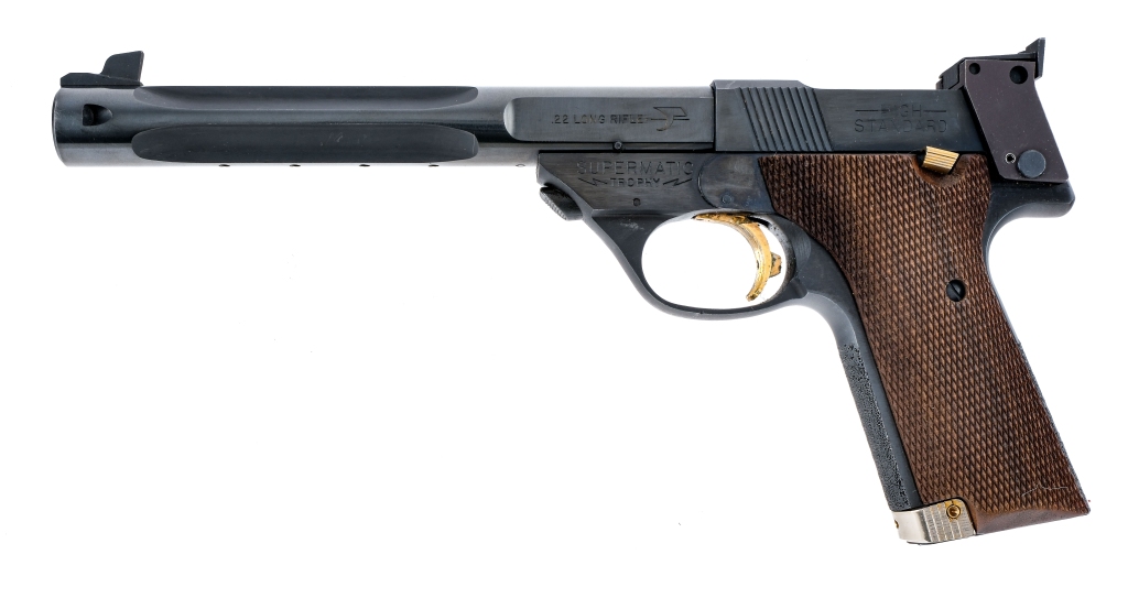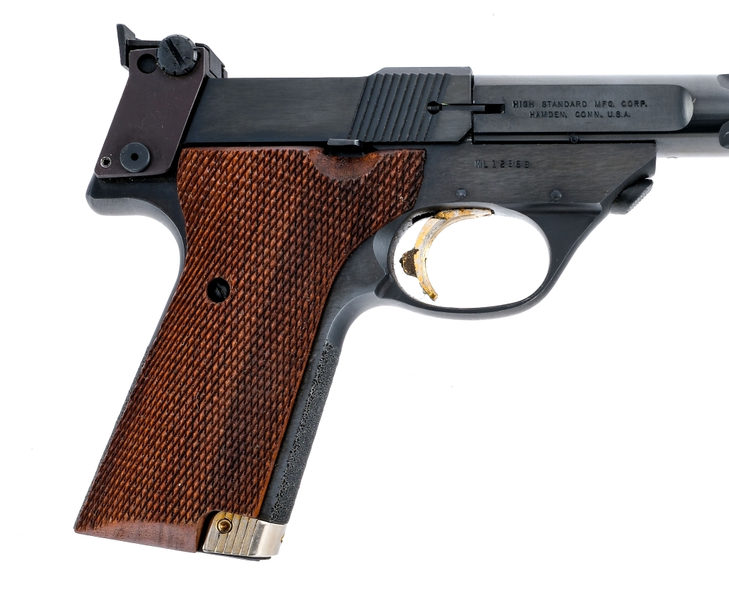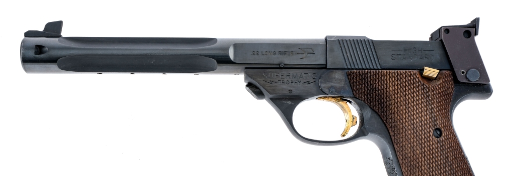 Description High Standard Supermatic Trophy chambered in .22 long rifle with four, ten round removable magazines and a 7 1/4″ barrel. Manufactured in 1976 with serial number ML12969. Blued steel frame with checkered wood grips. The front and backstrap are stippled. Gold plated trigger, magazine release, and manual thumb safety. Blued barrel and serrated slide. Adjustable rear sight and fixed front blade. Must ship to a FFL holder. Condition: Very Good with light scratches and cosmetic handling wear. Light internal wear from normal operation. Some finish loss/thinning on the gold parts. Light wear on the grips. Bright and clean bore with strong rifling. Barrel Length: 7 1/4″ Serial: ML12969 Manufacturer: HIGH STANDARD MANUFACTURI Year: 1976 Caliber: .22 Long Rifle Model: Supermatic Trophy Book# 07897