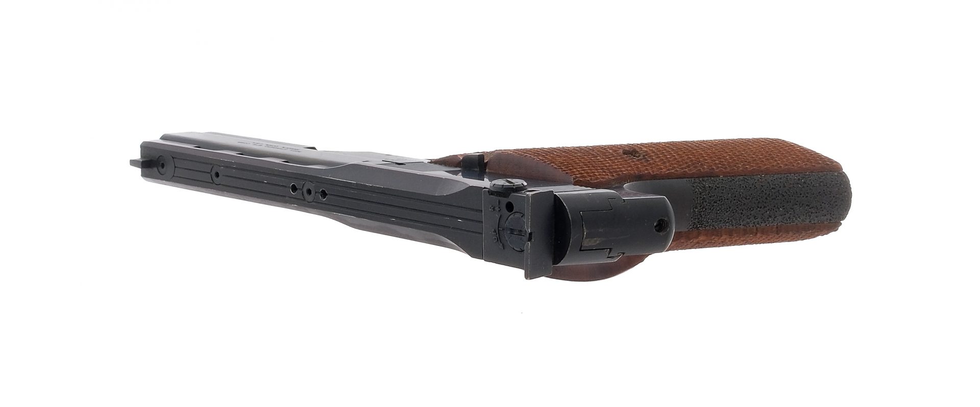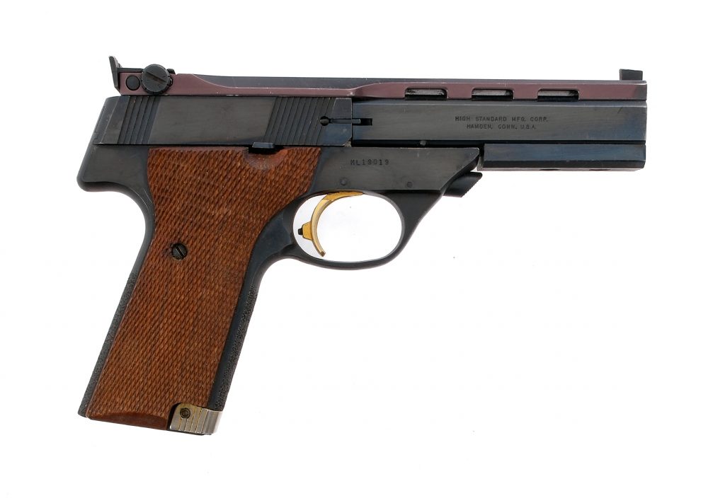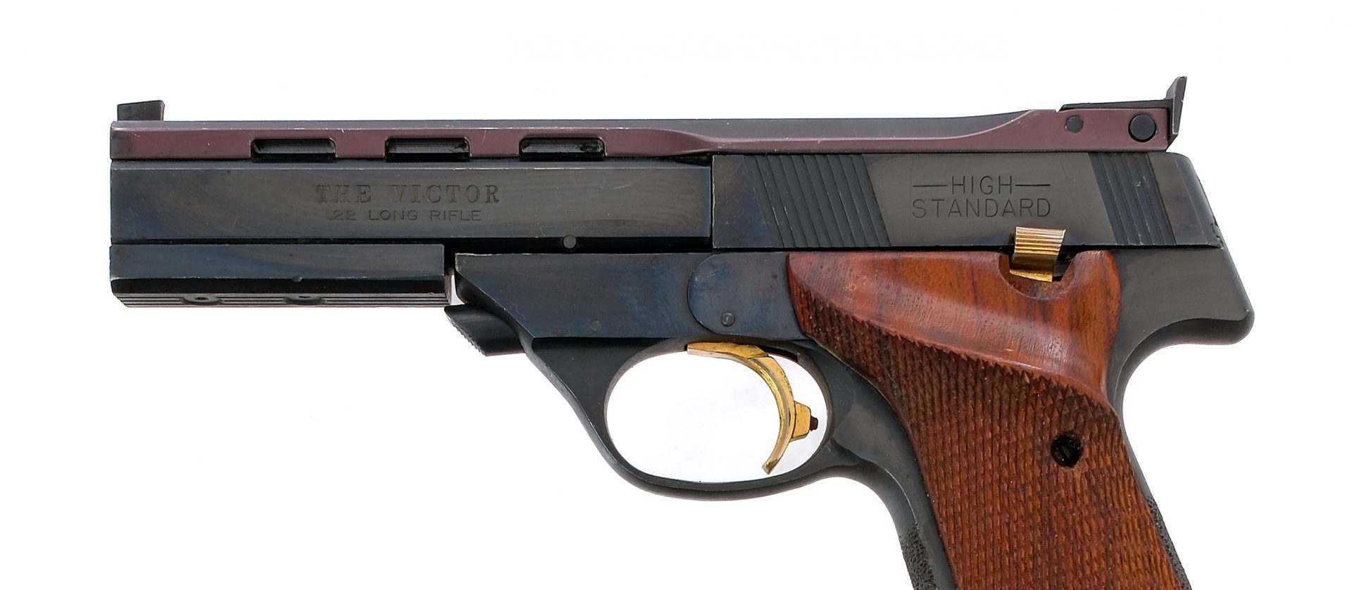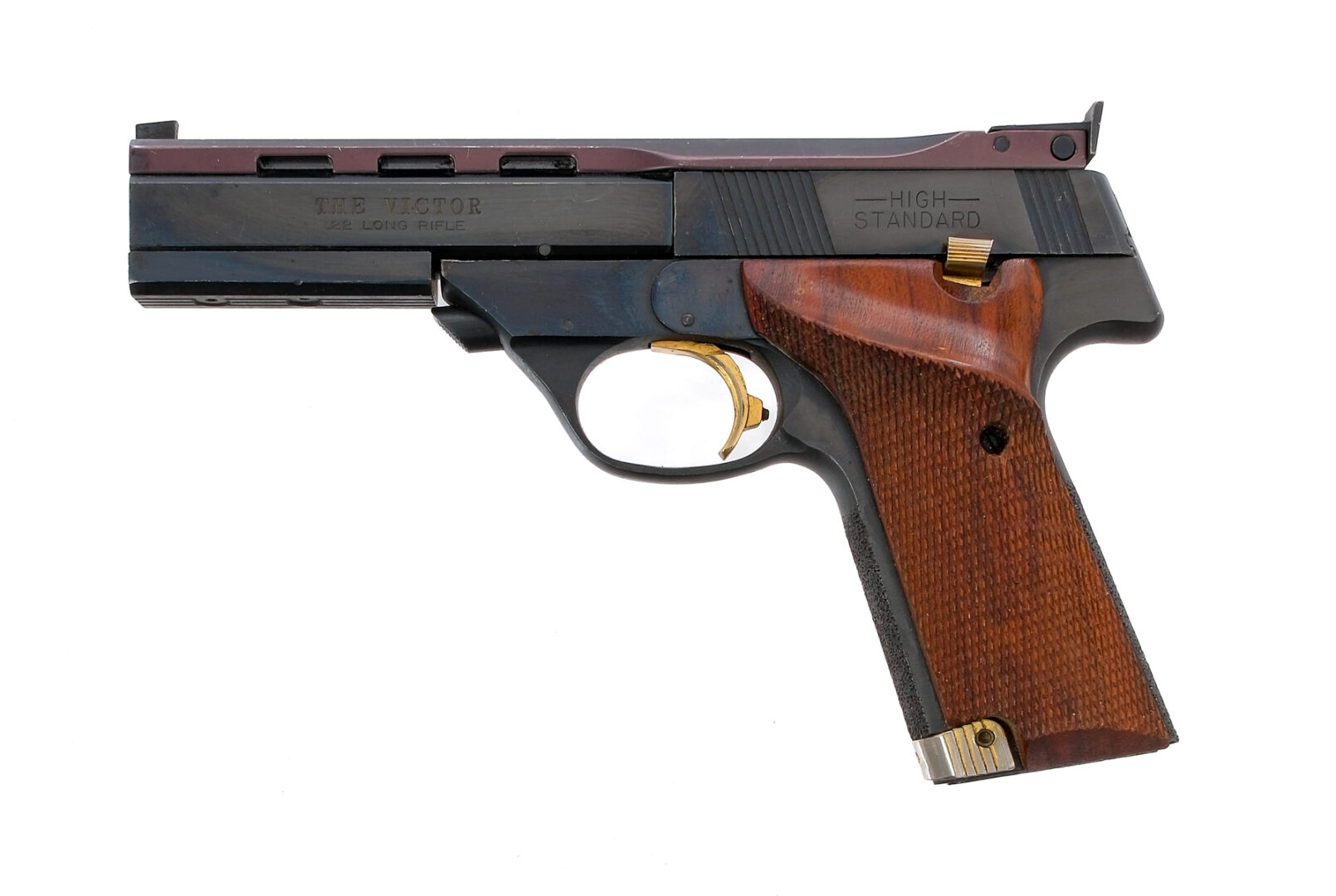 Description High Standard Model The Victor chambered in .22LR with a 4.5″ barrel and one 10 round removable magazine. Features checkered target grips, fixed front sight with adjustable rear sight, serrated adjustable gold trigger, gold magazine release and safety lever, interchangeable target barrel with weight attachment and vented rib. Both front and back straps are stippled. Must ship to a FFL holder. Condition: Good, Very Good, with operational and handling wear, some finish loss on gold parts more on magazine release, some bluing loss on high edges of frame and slide, some finish loss on top of ribbed vents, and small amount of oxidization on rear right slide serrations. Bore is bright with strong rifling. Barrel Length: 4.5″ Serial: ML19019 Manufacturer: High Standard Caliber: .22 LR Model: The Victor Year-Range 1975-1976 Book# 02862