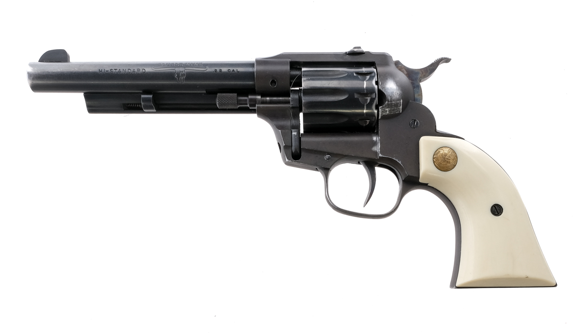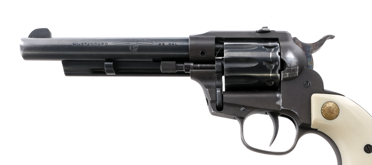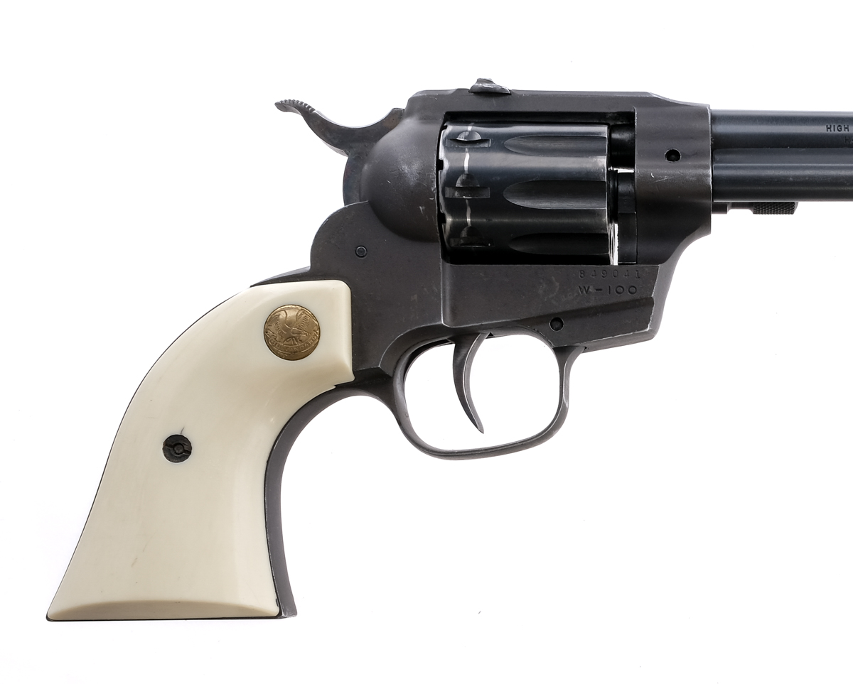 Description High Standard W-100 Double Nine in .22 caliber with a nine round capacity and a 5.5″ barrel. Smooth white composite grip plates. Parkerized finished frame. Case colored trigger and serrated hammer. Blued cylinder and barrel. Left side checkered loading gate arm. Under barrel extraction rod. Front and rear fixed sights. Must ship to a C&R or FFL holder. Condition: Good, Very Good with finish wear/loss and handling wear. Clean rifled bore. Barrel Length: 5.5″ Serial: 849041 Manufacturer: High Standard Year: 1958 Caliber: .22 Model: W-100 Double Nine Book# 121