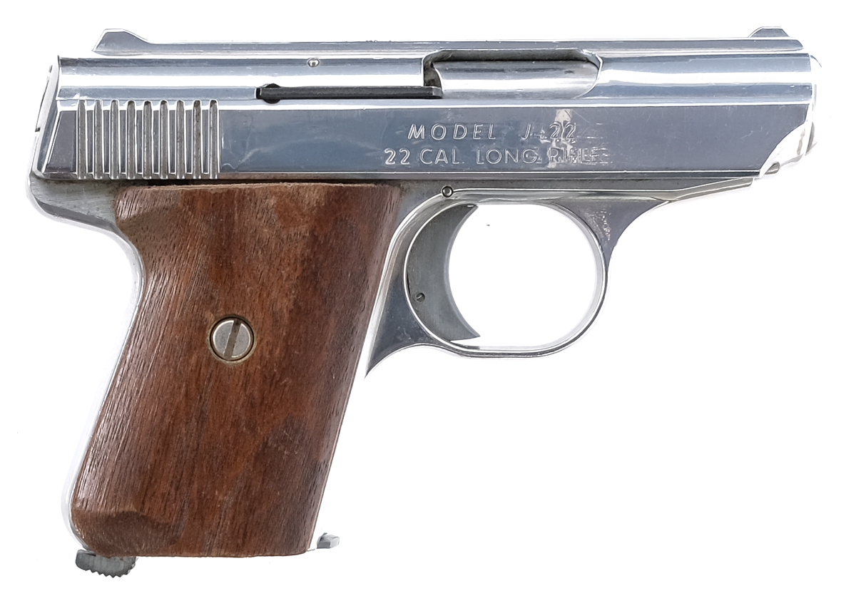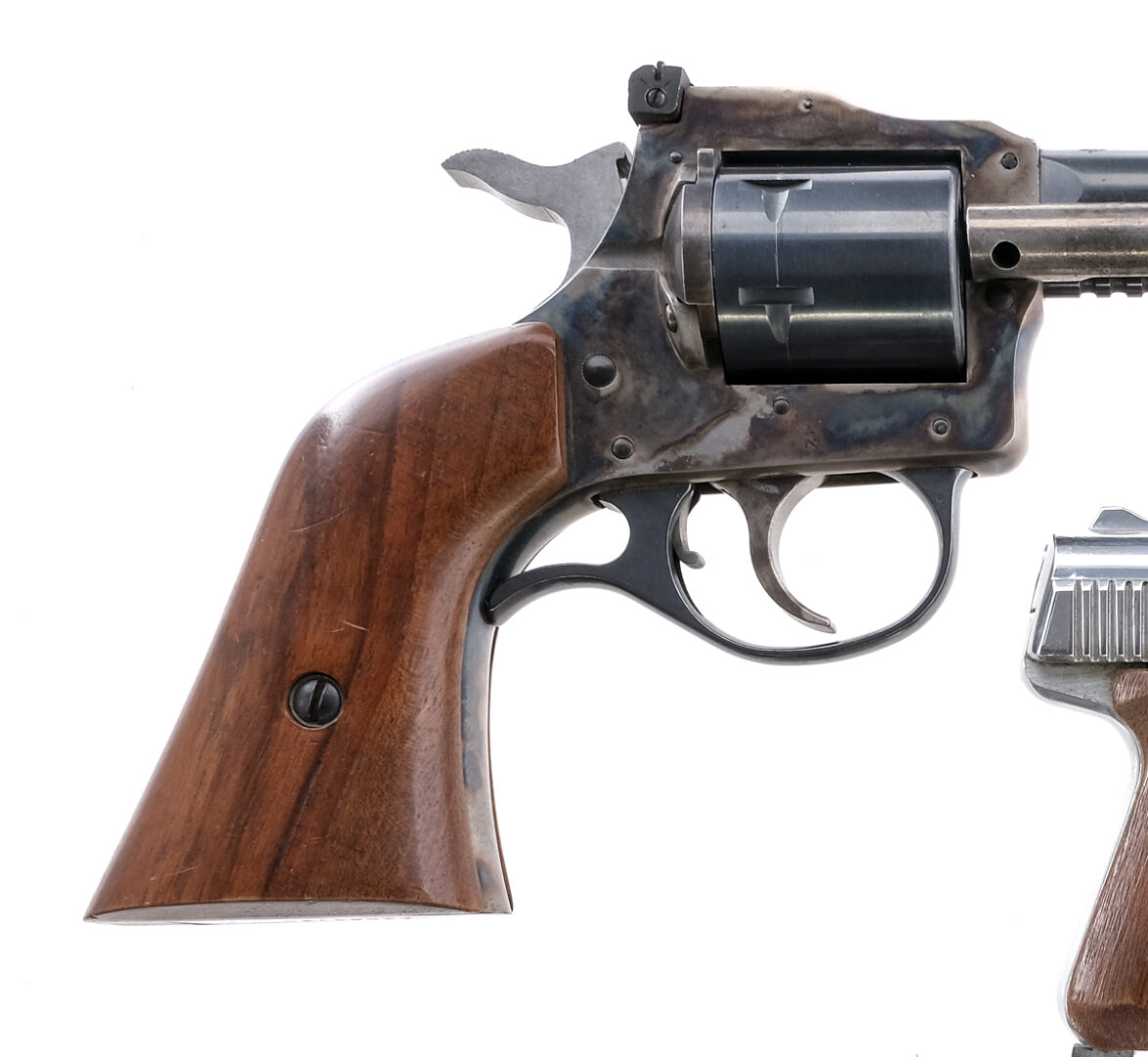 Description This lot is for two Estate found pistols. Harrington & Richardson Model 686 in .22 caliber with a six round capacity and a 7.5″ barrel. Smooth wood grip plates. Blued trigger guard, cylinder and barrel. Case colored trigger and frame. Unfinished serrated hammer. Right side of frame loading gate. Under barrel cylinder release pin and extraction rod. Rear adjustable and front fixed blade sight. Jennings J-22 in .22 Long Rifle with one, six round removable magazine and a 2.5″ barrel. Smooth wood grip plates. Nickel finished frame and serrated slide. Magwell located serrated magazine release. Front and rear fixed sights. Must ship to a FFL holder. Condition: Good with light scratches, touches of rust and handling wear. Both pistols have clean rifled bores. Sold AS-IS. Barrel Length: 2.5″ 7.5″ Serial: 120779 AX089790 Manufacturer: Jennings Harrington & Ric Caliber: .22 LR Model: 686 J-22 Book# 307 309