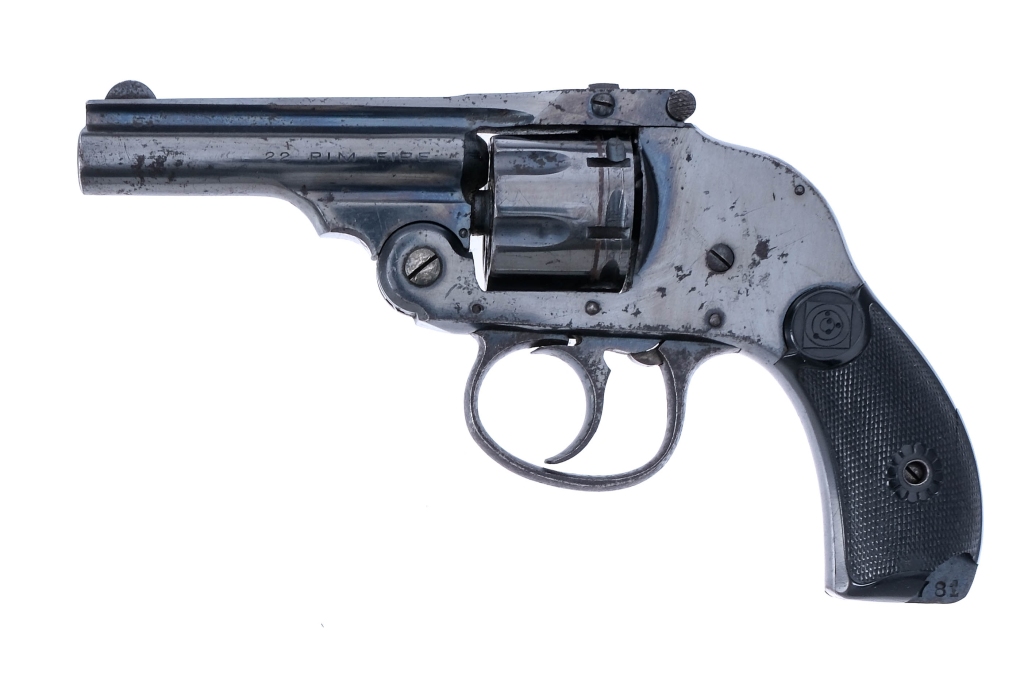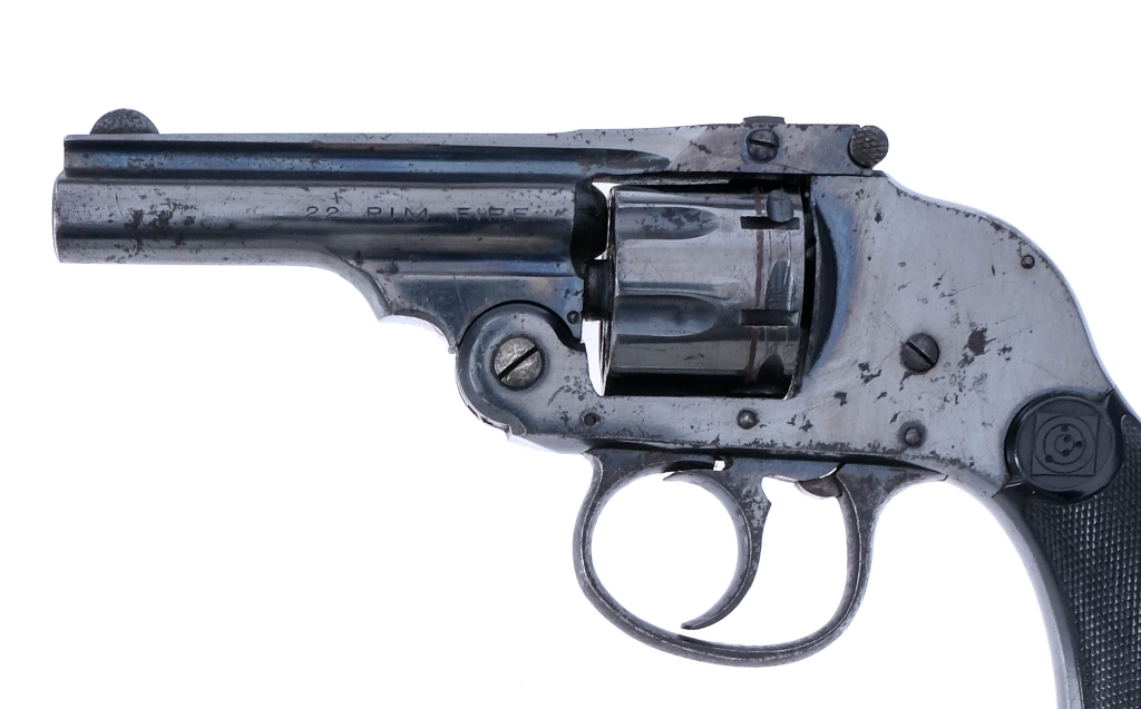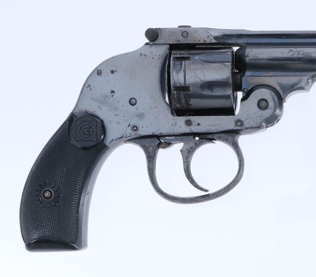Description Harrington & Richardson Top Break Hammerless chambered in .22 Rimfire with a seven-shot cylinder and a 3″ barrel. Blued barrel, frame, fluted cylinder, double trigger, and trigger guard. Checkered polymer grips. Rear notch and fixed front blade. Must ship to a FFL or C&R holder. Condition: Scratches, contact marks, sharp edge wear, and general cosmetic handling wear. Spots and speckling of metal oxidation. Light wear on the grips. Bright and clean bore with strong rifling. Barrel Length: 3″ Serial: 14781 Manufacturer: HARRINGTON & RICHARDSON A Caliber: .22 Rimfire Model: Top Break Hammerless Book# 07745
