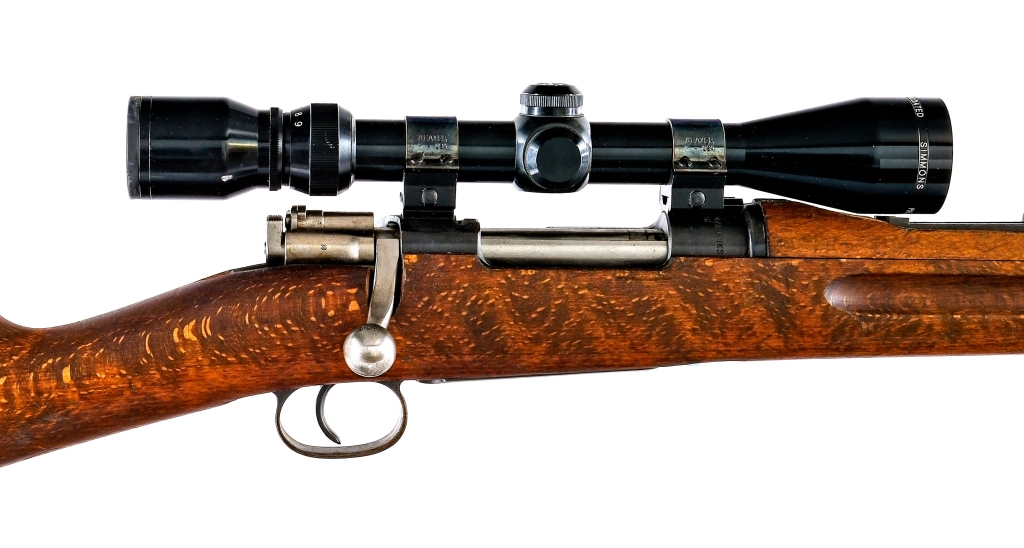 Description Swedish Husqvarna Model 1938 chambered in 6.5x55mm with a five round capacity and a 24″ barrel with mounted flash hider. Imported by SAMCO, marked on the barrel. Front cleaning rod and bayonet lug. Blued receiver, magazine floor plate, and trigger. Unfinished bolt with flag style safety. The bolt appears to have been bent further, to allow scope clearance. Adjustable rear rear ladder sight and fixed front blade. The receiver is drilled and tapped and mounted with a 3-9x40WA Simmons scope on Weaver rings. The rear sight has been removed and the top forend was shaved down to allow the scope. Smooth wood top forend and straight grip stock with stock disk/plaque and metal butt plate. Must ship to a FFL or C&R holder. Condition: Good having been Sporterized. Scratches, sharp edge wear, and cosmetic handling wear. Spots of metal oxidation, finish thinning, and patina. The stock has been sanded and refinished at some points. Scratches and dings on the wood. Bright bore with some light spots of metal oxidation, strong visible rifling. Barrel Length: 24″ Serial: 645166 Manufacturer: HUSQVARNA Caliber: 6.5x55mm Model: M38 Book# 07799