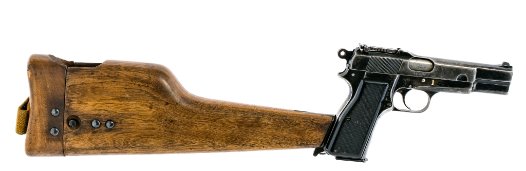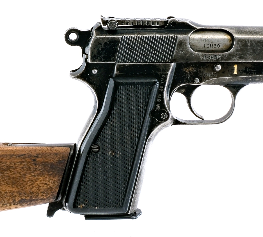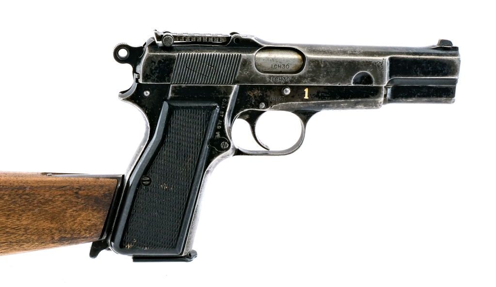 Description Chinese contract Inglis MK I* Hi Power chambered in 9mm with one, thirteen round removable magazine and a 4.7″ barrel. Manufactured in Canada and imported by C.A.I., marked on the right side of the frame. Black finished steel frame with stock lug, lanyard loop, and checkered polymer grips. Single action trigger and hammer. Frame mounted manual thumb safety and magazine disconnect safety. Black finished serrated slide with adjustable rear tangent sight and fixed front blade. The right side of the frame is painted with a 1. Serial number matching ICH30. Comes with a wood stock/holster marked “S.A. LTD 1944”. The marking is double stamped. Canvas lanyard with circled arrow mark. Must ship to a FFL holder. Check local laws regarding “High Capacity” magazine BEFORE bidding. Condition: God with scratches, scuffs, contact marks, and general handling wear. Much of the finish is lost/worn. Scratches and wear on the grips. Bright and clean bore with strong rifling. Barrel Length: 4.7″ Serial: ICH30 Manufacturer: INGLIS HI-POWERS Caliber: 9x19mm Parabellum Model: Hi Power Mk I * Book# 06603