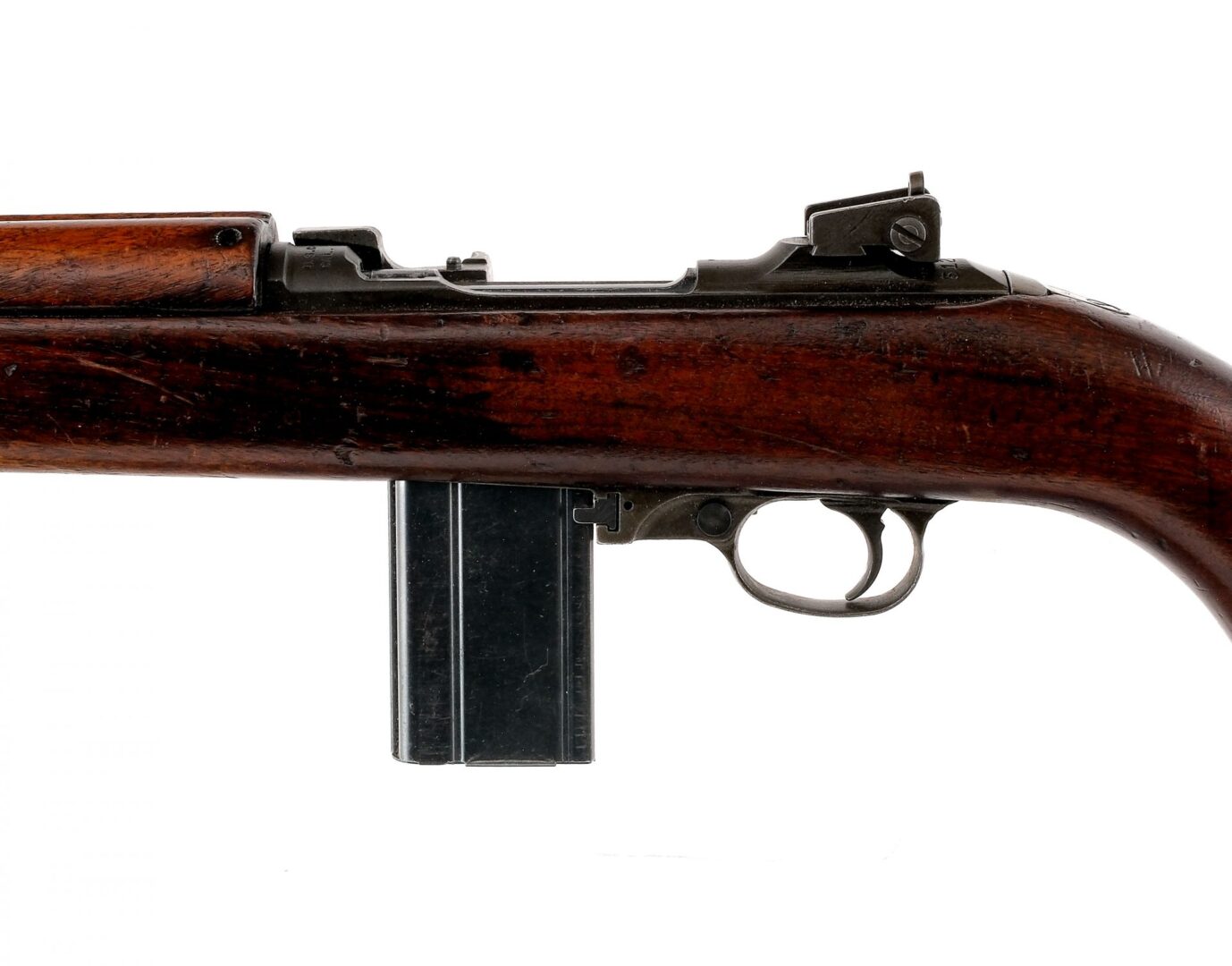 Description World War II Inland M1 Carbine chambered in .30 Carbine with one, fifteen round removable magazine and a 18″ General Motors barrel dated to 5-43. The receiver was manufactured in 1943 with serial number 512059. Type 3 barrel band with bayonet lug and sling swivel. Type 3 stock with low wood and oval oiler cut. Two rivet wood top handguard. Parkerized receiver, operating rod, and trigger guard. Early flat top bolt. Rotary safety selector. Adjustable rear sight and fixed protected front blade. The right side of the stock has a faded Springfield Armory Cross Cannons cartouche. The left side of the stock has a Italian “Star” FAT77 cartouche. Circled P cartouches on the grip of the stock. “417” Rack number on the bottom of the stock forward of the magazine well. Must ship to a FFL holder. Check local laws regarding “High Capacity” magazines BEFORE bidding. Condition: Good/Very good with general scratches, sharp edge wear, and normal handling wear. Some wear on the moving parts and contact points from operation. Some small spots of metal oxidation. Finish patina/discoloration from oil and age. Scratches, scuffs, and dings in the stock. Barrel Length: 18″ Serial: 512059 Manufacturer: INLAND (PREVIOUS MFG.) Year: 1943 Caliber: .30 Carbine Model: M1 Carbine Book# 04219