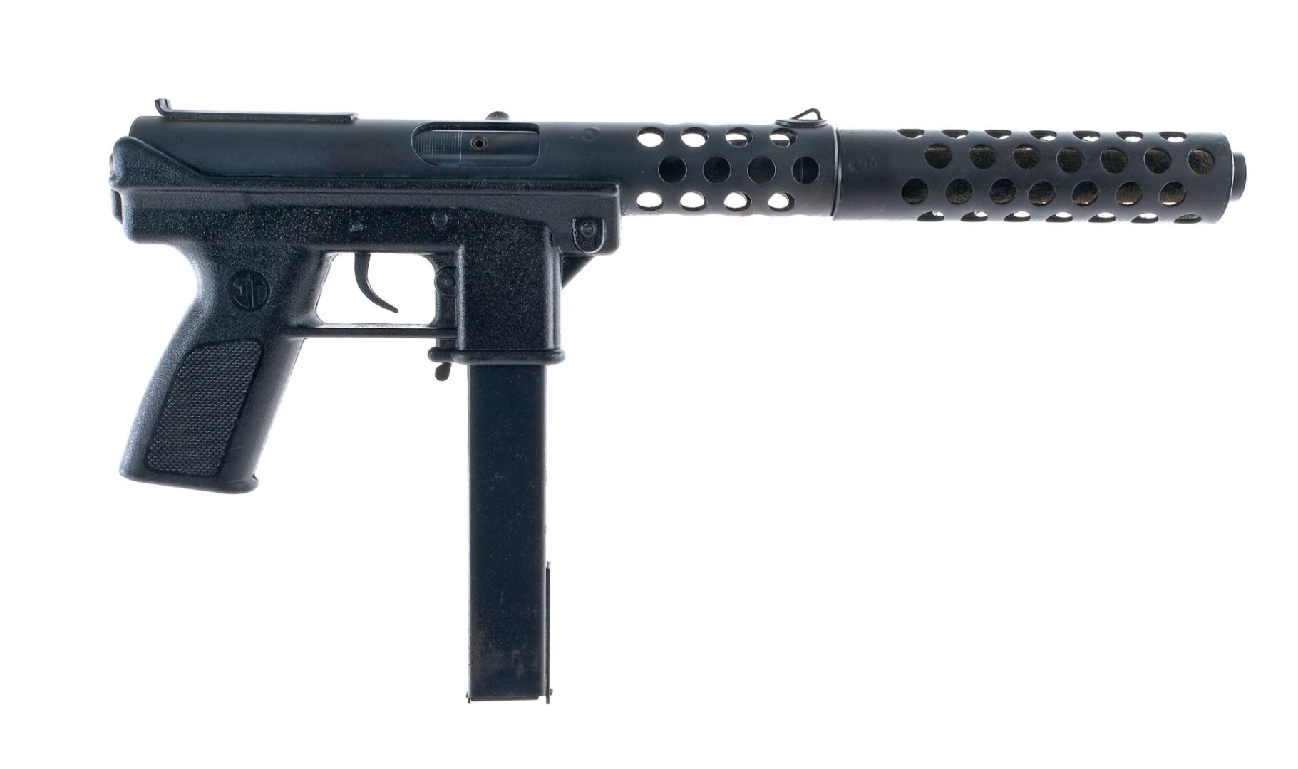 Description Intratec Tec9 in 9mm with four, thirty six round removable magazines and a 5.5″ barrel with 7.5″ removable shroud and muzzle break. Checkered black composite pistol grip on frame. Blued trigger, top frame and barrel. Magwell located magazine release. Left side of frame charging handle. Left side of frame metal loops for mounting a shoulder sling. Comes with zipper carry bag, barrel shroud, instruction manual and muzzle break. Check Local/State Laws on High Capacity Magazines and Threaded Barrels BEFORE BIDDING. Must ship to a FFL holder. Condition: Very Good with scuffs and handling wear. The foam inside the bag has deteriorated. Clean rifled bore. Barrel Length: 5.5″ Serial: 38026 Manufacturer: Intratec Caliber: 9mm Model: Tec-9 Book# 01609