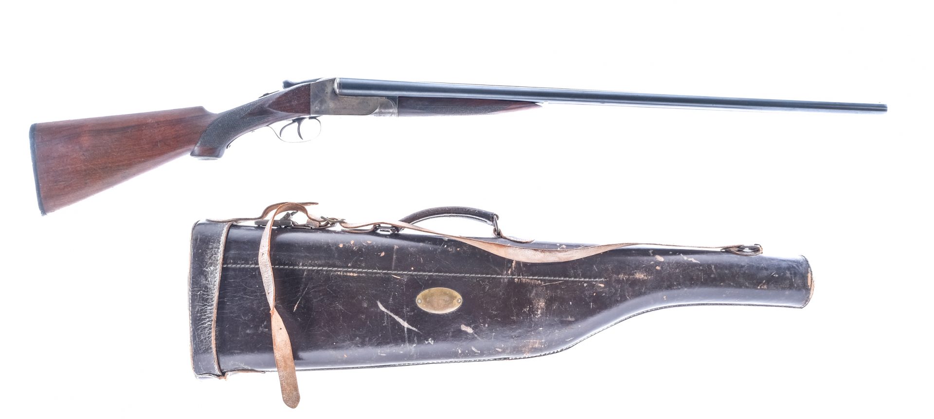 Description Ithaca Gun Co side by side in 20 gauge with a two round capacity and a 28″ barrel. Right side has a IMP CYL and the left side a FULL fixed choke. Checkered composite butt plate. Checkered wood stock and front foregrip. Engraved trigger guard and receiver. Blued double triggers, checkered top lever and barrel. Rear receiver tang serrated slide button safety. Front fixed brass bead sight. Comes in a vintage leather carry case. Must ship to a C&R or FFL holder. Condition: Good with wood dings, scratches, finish wear/loss and handling wear. Very light spots of rust in the two bores. Barrel Length: 28″ Serial: 263055 Manufacturer: Ithaca Gun Co Gauge: 20 Model: SxS Shotgun Book# 10-475