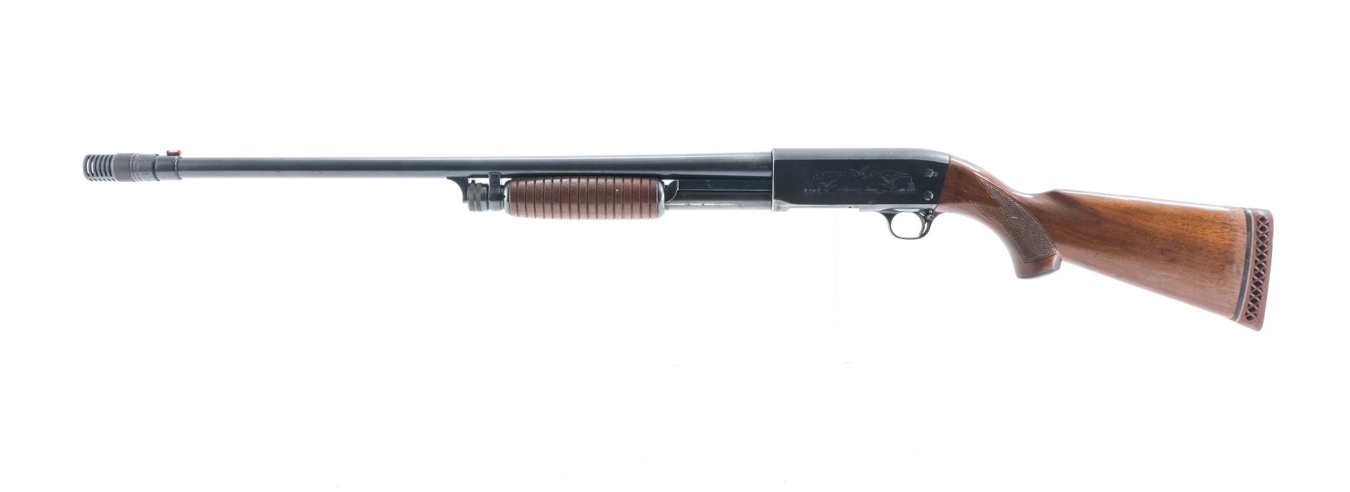 Description Ithaca Model 37 Featherlight in 12 ga 2 3/4″ with a four round capacity and a 26″ barrel with a Poly Choke selectable choke. Rubber Pachmayr butt pad. Solid wood checkered butt stock and serrated front foregrip. Blued factory engraved receiver, trigger guard, barrel and magazine tube. Front glow rod fixed sight. Rear trigger guard checkered push button safety. Right side of trigger guard serrated action release. Must ship to a C&R or FFL holder.