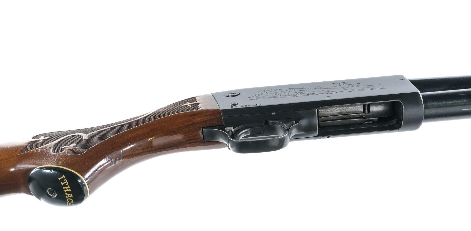 Description Ithaca Model 37 Featherlight Deerslayer in 12 gauge 2 3/4″ with a four round capacity and a 20.5″ barrel. Rubber butt pad. Checkered wood stock and front foregrip. Blued trigger guard, trigger, receiver, magazine tube and barrel. Rear trigger guard push button safety. Front trigger guard serrated action release. Rear adjustable and front fixed fiber optic blade sight. Top of receiver is drilled and tapped for optics. Comes mounted with a Remington nylon shoulder sling. Must ship to a FFL holder. Condition: Good/Very Good with scratches, scuffs and wood dings. Clean smooth bore. Barrel Length: 20.5″ Serial: 371425443 Manufacturer: Ithaca Gauge: 12 Year: 1975 Model: 37 Featherlight Deerslayer Book# 485