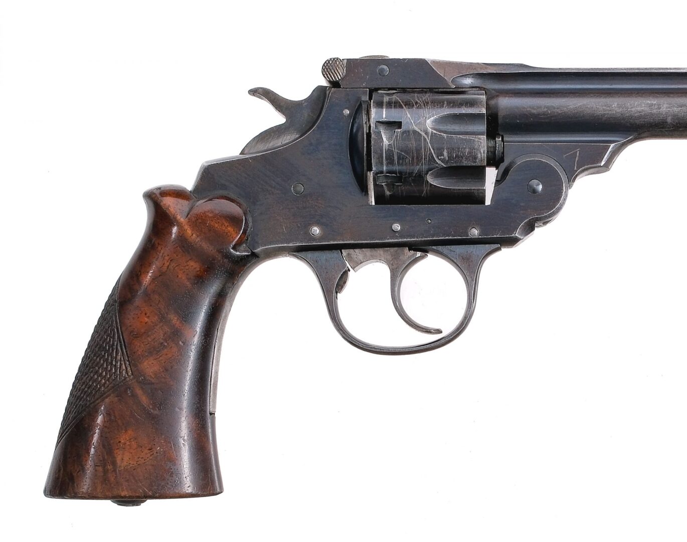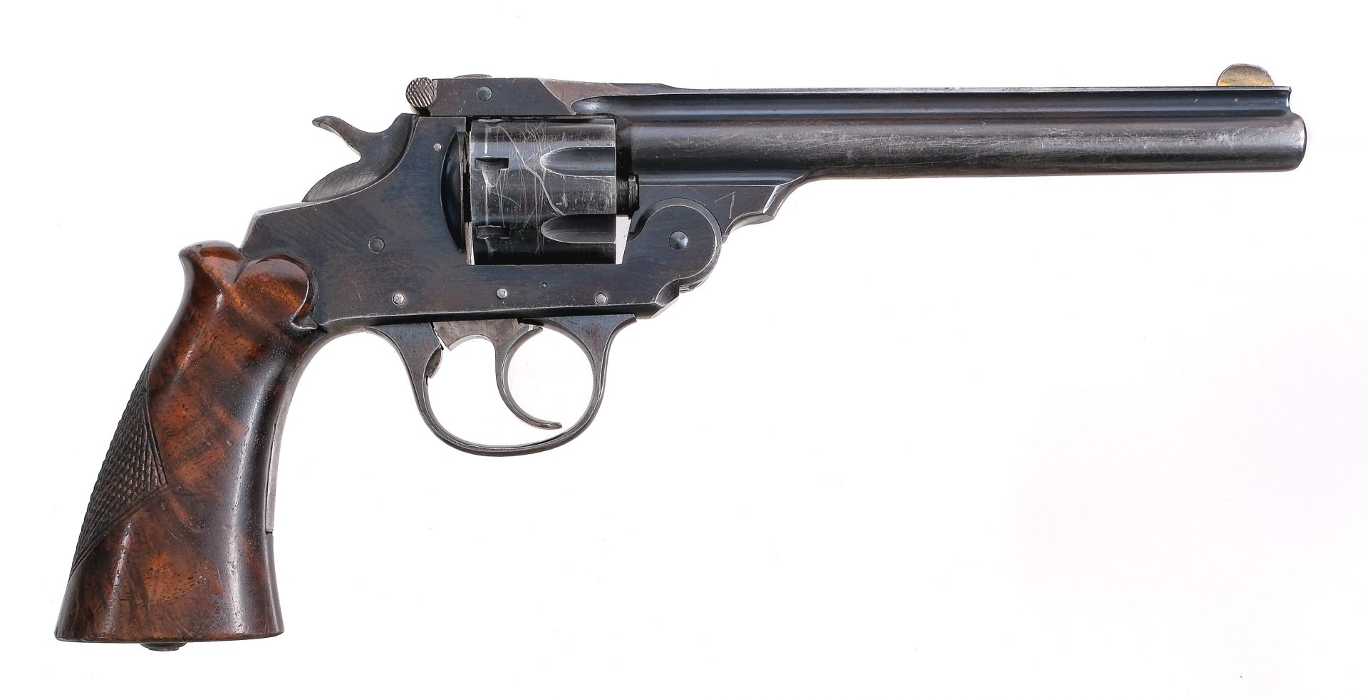 Description Iver Johnson 22 Supershot chambered in .22 long rifle with a seven-shot cylinder and a 6″ barrel. Top break revolver with blued barrel, frame, and fluted cylinder. Case colored double/single action trigger and hammer. The Trigger does not function properly in double action. Checkered wood grip. Fixed iron sights with rear notch and fixed front blade. Must ship to a FFL or C&R holder. Condition: Poor mainly due to the trigger not functioning properly. When trying to shoot double action the trigger only rotates the cylinder but does not cock the hammer and fire. The trigger in single action appears to work properly. General scratches, scuffs, and finish loss. Various finish patina and spots of metal oxidation. Light scratches and dings on the wood. Bright and clean bore with strong rifling. SOLD AS-IS. Barrel Length: 6″ Serial: 4345 Manufacturer: IVER JOHNSON ARMS Caliber: .22 Long Rifle Model: 22 Supershot Book# 03854