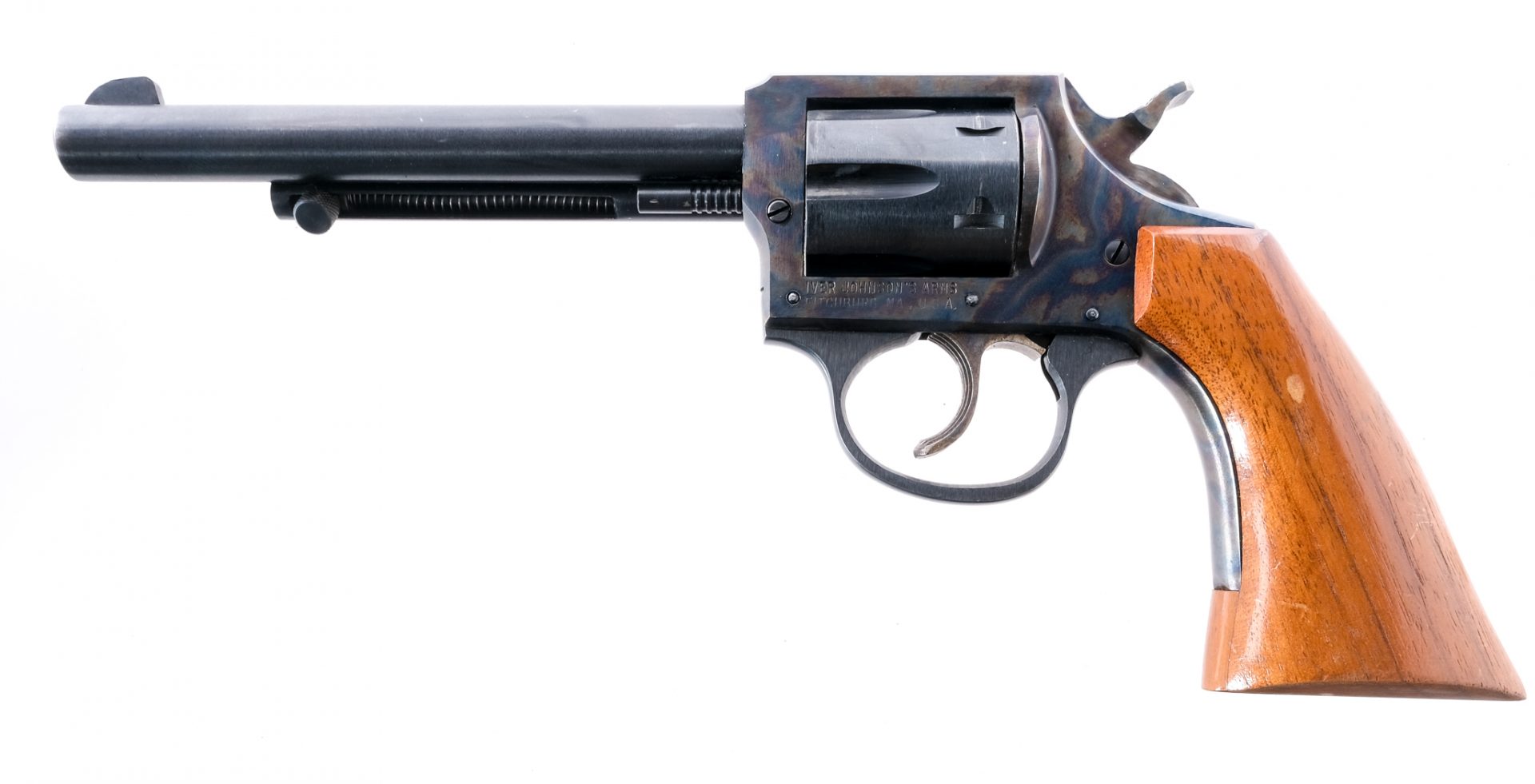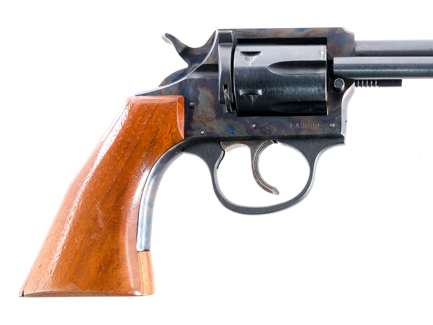 Description Iver Johnson 50 Sidewinder in .22 caliber with a six round capacity and a 6″ barrel. Smooth wood grip plates. Blued trigger guard, cylinder and barrel. Case colored serrated trigger, frame and serrated hammer. Right side of frame loading gate. Under barrel cylinder release pin and ejection rod housing. Front and rear fixed sights. Must ship to a FFL holder. Condition: Good/Very Good with wood damage to the butt and handling wear. Clean rifled bore. Barrel Length: 6″ Serial: E40280 Manufacturer: Iver Johnson Caliber: .22 Model: DA Year-Range 1974-1975 Book# 9-009