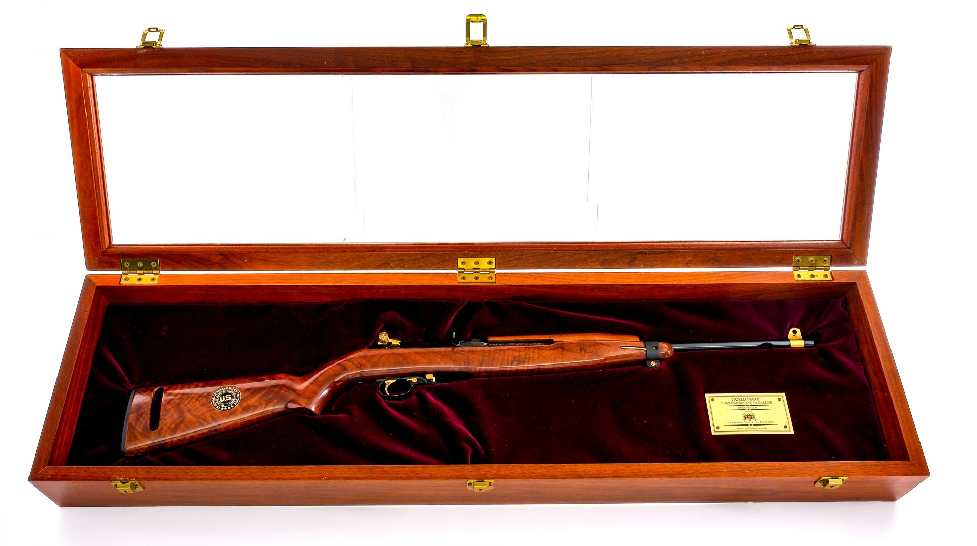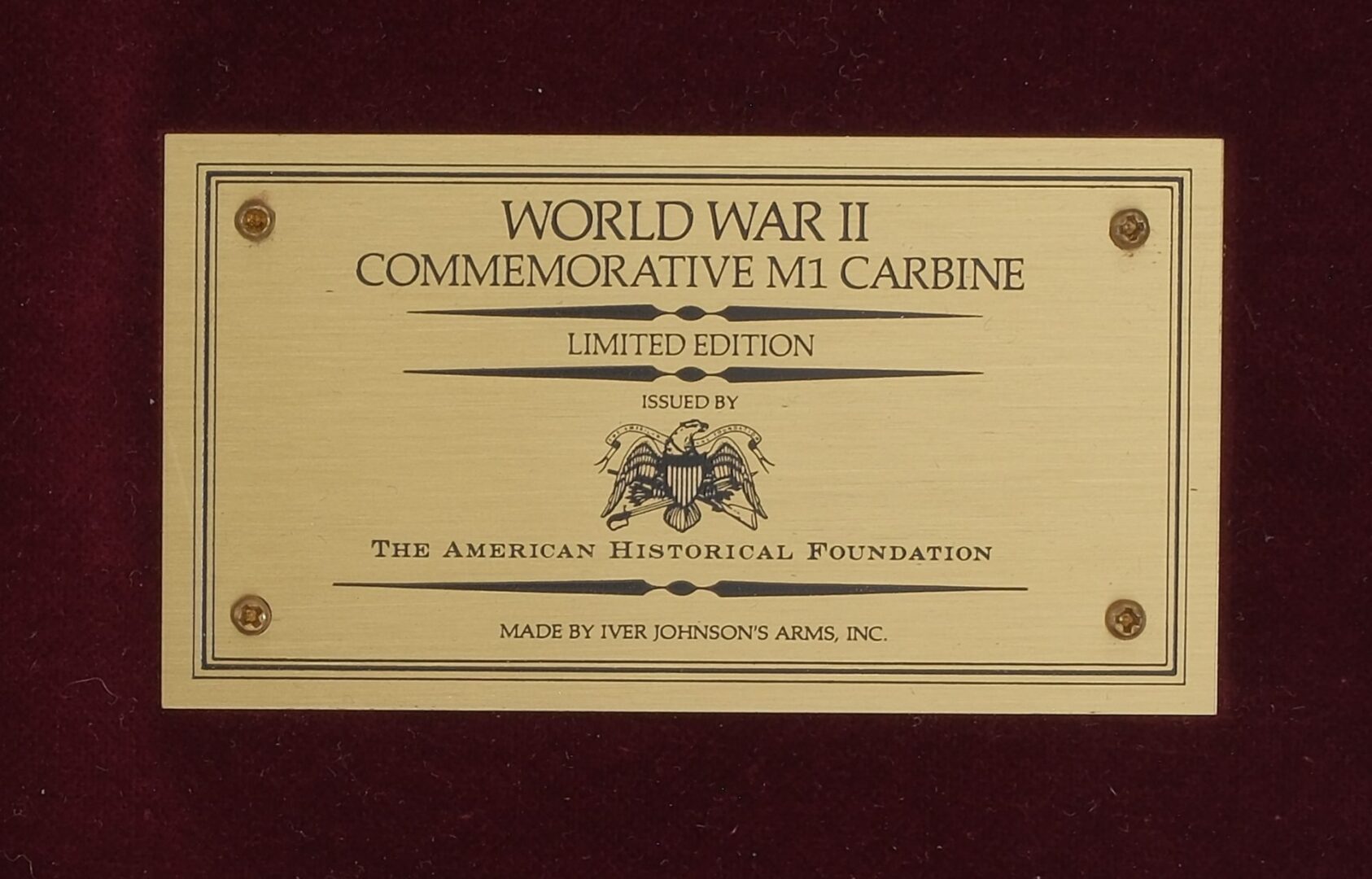 Description Iver Johnson M1 Carbine Limited Edition World War II Commemorative issued by The American Historical Foundation in .30 carbine missing its magazine with a 18″ barrel. Blued metal butt plate. Smooth premium wood stock. Blued trigger guard, receiver, charging handle and barrel. Real 24kt gold finished trigger, safety, magazine release, front/rear sight and front barrel band spring. Trigger guard located magazine release and safety switch. Rear adjustable and front fixed blade sight. Comes in a solid walnut faux velvet lined display case. This rifle is number 24 of only 2500 ever made. Must ship to a FFL holder. Additional shipping cost for case. Condition: Very Good with light scratches and wood dings. Clean rifled bore. Barrel Length: 18″ Serial: WW0024 Manufacturer: Iver Johnson Year: 1985 Caliber: .30 M1 Model: M1 Carbine Commemorative Book# 03288