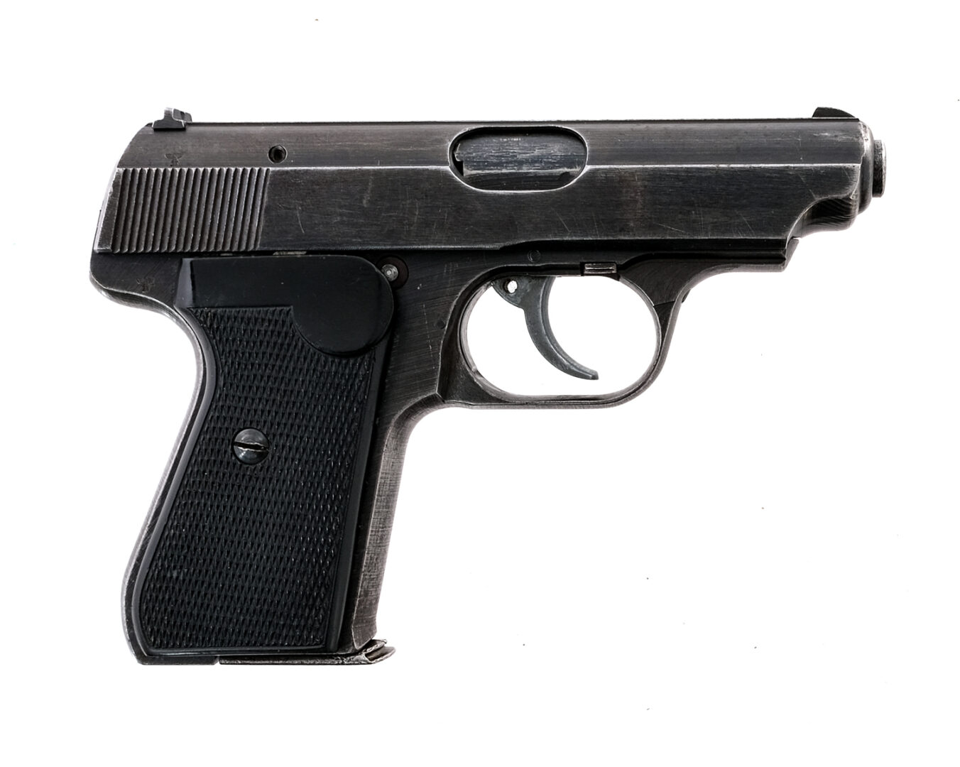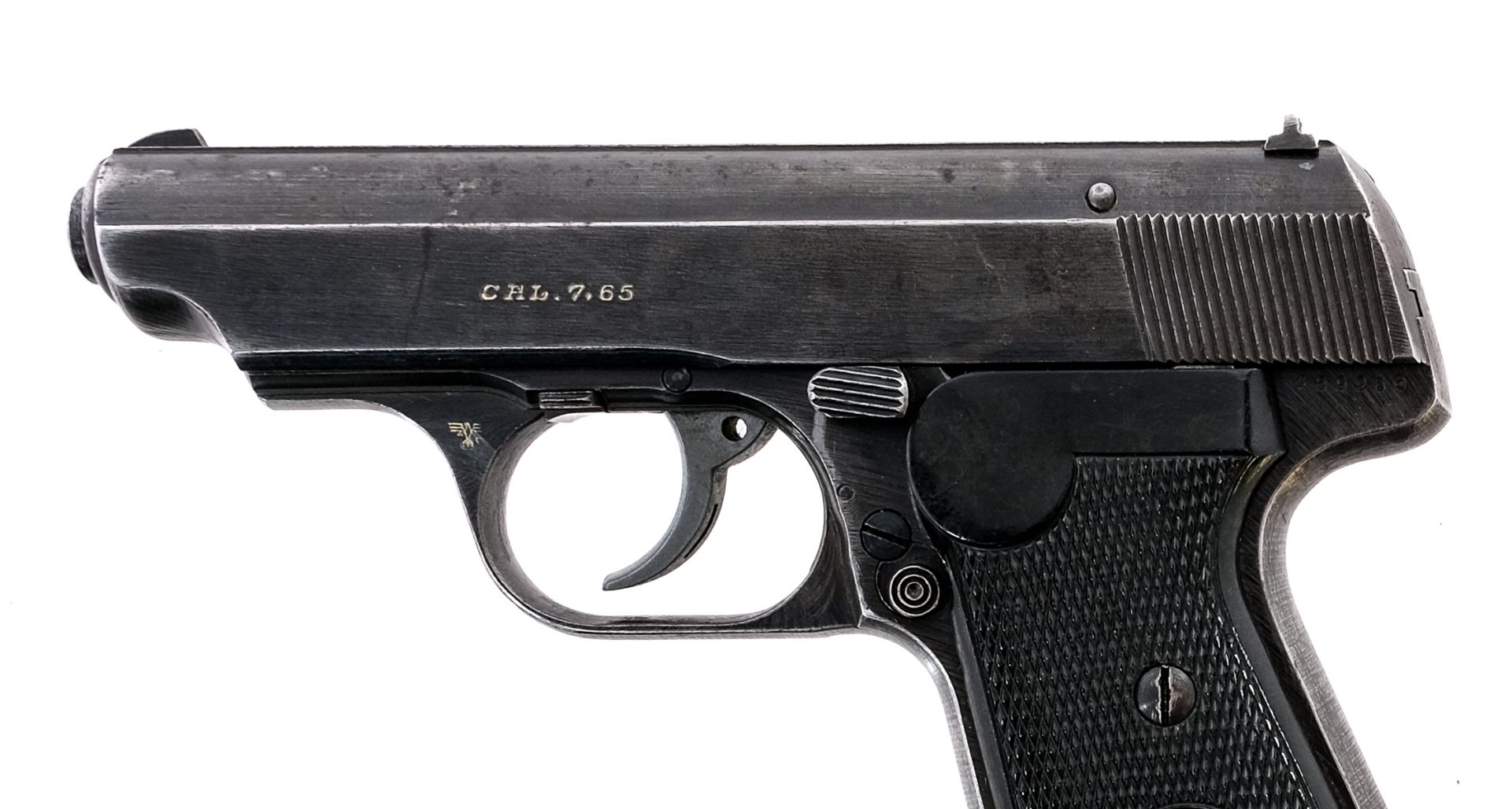 Description J.P. Sauer & Sohn 38H chambered in 7.65 (.32) with one, eight round removable magazine and a 3.5″ blued barrel. Blued steel frame with black composite checkered grips and a push button magazine release. Double/single action with internal hammer and frame mounted cocking/de-cocking lever. Blued serrated slide with integral iron sights. Matching slide and frame. German eagle over “N” nitrocellulose proof marks on the right side of the slide and frame. German eagle with “F” proof mark on the front right side of the trigger guard. Comes with a leather holster marked “Schambach and CO BERLIN 1942” and German eagle stamp. Must ship to FFL or C&R holder. Condition: Good/Very good with scratches and some finish loss/patina. The bluing has Patinated to a more “distressed” finish. The slide has light spots of metal oxidation going across the top. The grips are in good shape with light scratches/wear and the checkering is still strong. Clean rifle bore. Barrel Length: 3.5″ Serial: 489263 Manufacturer: J.P. Sauer and Sohn Caliber: .32 ACP Model: 38H Book# 00522