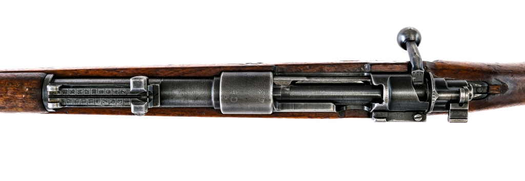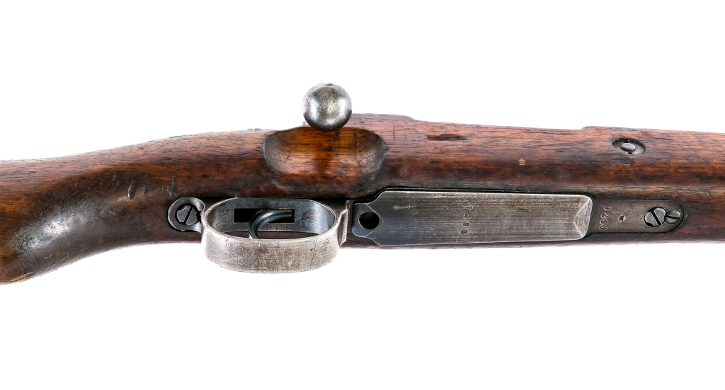 Description J.P. Sauer & Sohn Model 98 ( K98 ) in 8mm with a five round capacity and a 24″ barrel. Import marked on the muzzle end of barrel by C.A.I. ST. ALB. VT.-Century Arms. All matching serial numbered rifle. Made in Germany in 1943. Metal cupped butt plate marked: gqm 43 with Waffenamt 88. Smooth wood stock with metal eyelet for disassembling the bolt. Lower right side of stock is marked with a German Third Reich Eagle and Waffenamt 135. Blued trigger guard, trigger, receiver, bolt and barrel. Rear bolt safety. Rear left side of receiver bolt release. Under barrel fixed bayonet lug. Rear flip up adjustable and front fixed blade sight. Metal loops and stock slot for mounting a shoulder sling. Stock slot marked: K 3. Top of receiver marked with Wartime code CE for JP Sauer. Right side of receiver has illegible Waffenamt starting with 28. Left side of receiver has German Third Reich Eagle proofs. Waffenamt 135 proof on the top right of receiver. Right side of barrel marked: 43D. Waffenamt 135 proof on the bottom of magazine floor plate. Serial numbers matching on the rifle including the receiver, bolt, bolt release, safety switch, magazine floor plate, trigger guard plate, underside of sight, internal firing pin, front barrel band and nose cap. Must ship to a C&R or FFL holder. Condition: Good with scratches, finish wear/loss, heavier wood dings/chips, missing cleaning rod and handling wear. Clean rifle bore. Barrel Length: 24″ Serial: 1293 Manufacturer: J.P. Sauer & Sohn Year: 1943 Caliber: 8mm Mauser Model: Mod 98 K98 Book# 07061