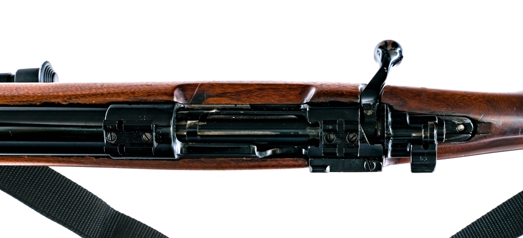 Description J.P. Sauer & Sohn 1917 Gew 98 Custom in 6mm Remington with a single round capacity and a 26″ Heavy Bull Barrel. Rubber butt pad. Smooth Monte Carlo style wood stock. Blued trigger guard, trigger, receiver, bolt and barrel. Rear bolt safety switch. No fixed sights. Top of receiver has optics rails. Forend mounted fold out adjustable bipod. Comes with nylon shoulder sling. Must ship to a FFL holder. Condition: Fair as refinished with scratches, finish wear/loss, refinished/replaced parts, wood damage and fills around the receiver and handling wear. Clean rifled bore. Barrel Length: 26″ Serial: 4108A Manufacturer: JP Sauer & Sohn Year: 1917 Caliber: 6mm Remington Model: Gew 98 Custom Book# 07842