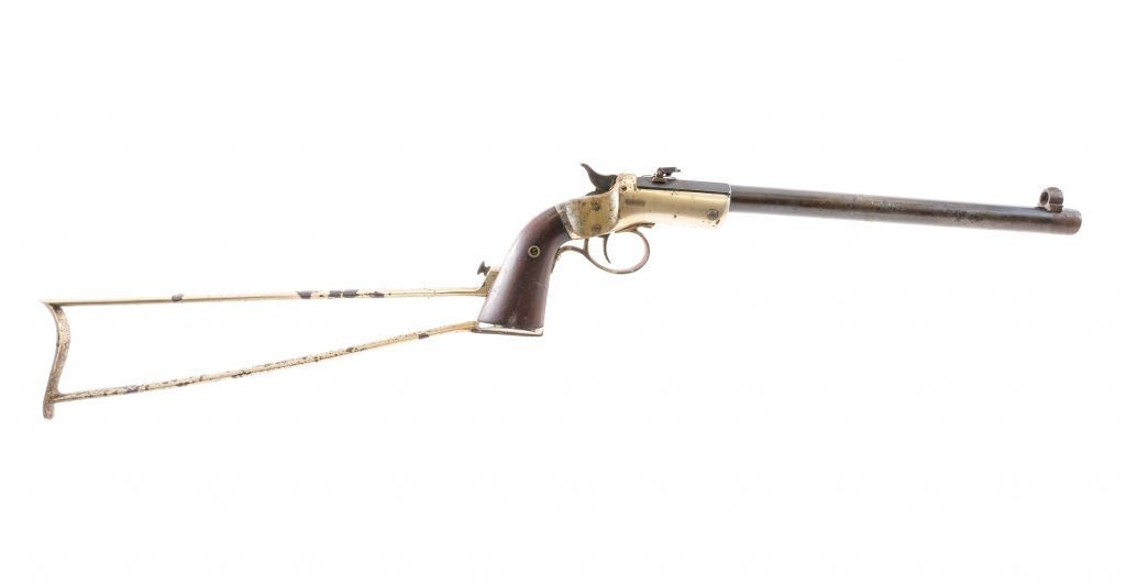 Description J. Stevens A&T Company Bicycle Gun in .32 Rimfire with a single round capacity and a 10″ barrel. Wire shoulder brace with detachment screw. Smooth wood grip plates. Nickel plates frame and trigger guard. Blued untextured trigger, checkered hammer and barrel. Rear flip up adjustable and front hooded fixed blade sight. Antique, No FFL required and ships to buyers home. Condition: Good/Very good with finish wear/loss, rust and light pitting. The rifled bore has a old light rust with strong visible rifling. Barrel Length: 10″ Serial: 22597 Manufacturer: J. Stevens A&T Co Caliber: .32 RF Model: Bicycle Gun