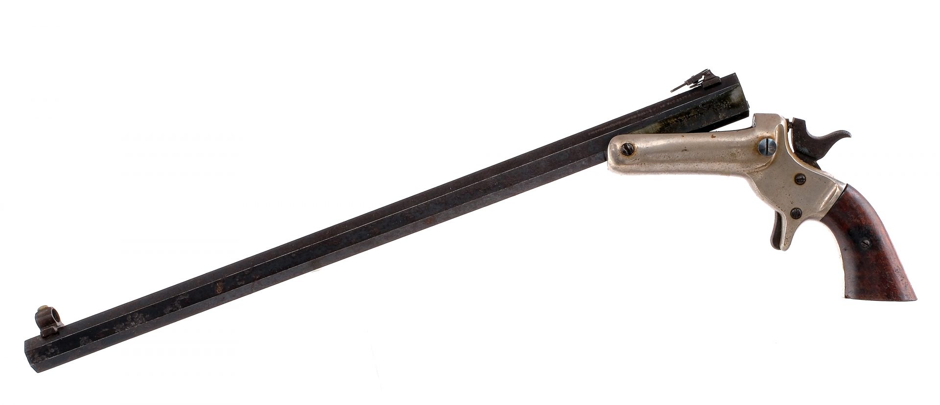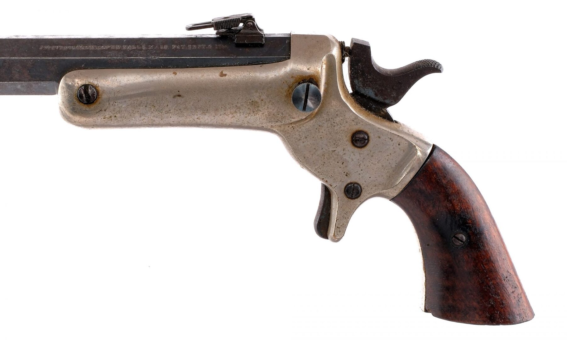 Description J. Stevens Hunters Pet in .32 Rimfire with a single round capacity and a 18″ octagon barrel. Made in Chicopee Falls Massachusetts with serial number 97. Smooth wood grip plates. Nickel finished frame. Blued solid trigger, checkered hammer and barrel. Left side of frame barrel tip up button. Rear flip up adjustable and front hooded fixed blade sight. Rear and bottom of backstrap is tapped for mounting a wire shoulder stock. Comes with a vintage partial box of Peters Improved Semi-Smokeless Ammunition with twenty one (21rds) unfired rounds in .32 Rimfire Long. Ammunition ships separately. Antique, No FFL required and ships to MOST buyers homes. Condition: Antique Good/Very Good with light scratches, wood dings, finish wear/loss and rust/pitting. The rifled bore has rust and pitting with weak visible rifling. Barrel Length: 18″ Serial: 97 Manufacturer: J. Stevens Caliber: .32 RF Model: Hunters Pet