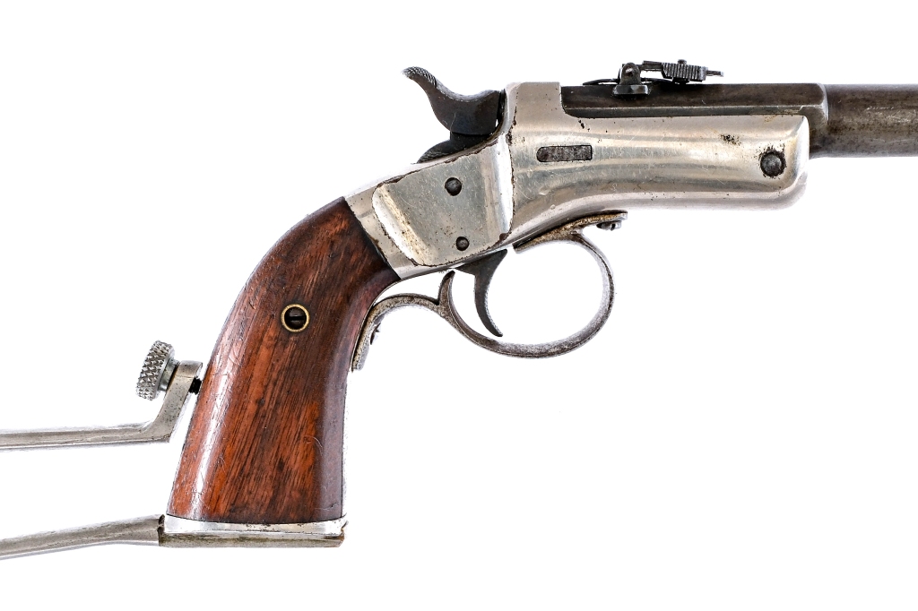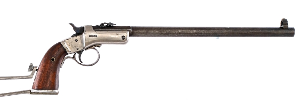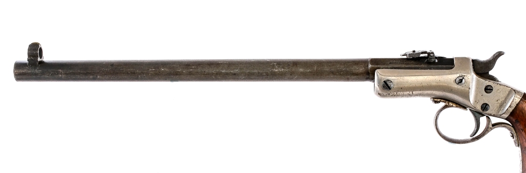 Description J. Stevens New Pocket 2nd Issue Pocket Rifle chambered in .22 rimfire with a single shot capacity and a 12″ break action barrel. Blued barrel, single action trigger, and hammer. Adjustable rear sight and hooded front post. Nickel finished frame and removable wire stock. Smooth wood grips. Must ship to a FFL or C&R holder. Condition: Good with scratches, sharp edge wear, and general cosmetic handling wear. Internal wear from normal operation/use. Finnish thinning on the blued parts with spots of patina and metal oxidation. Light scratches and dings on the grips. Bright and clean bore with strong rifling. The extractor functions but can come out too far if the action is opened with a lot of force. Barrel Length: 12″ Serial: 14670 Manufacturer: STEVENS, J., ARMS COMPANY Caliber: .22 Rimfire Model: New Pocket 2nd Issue Book# 07720
