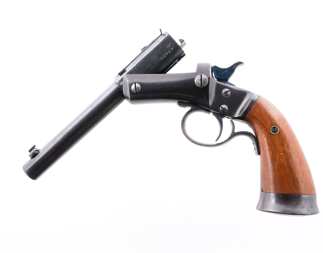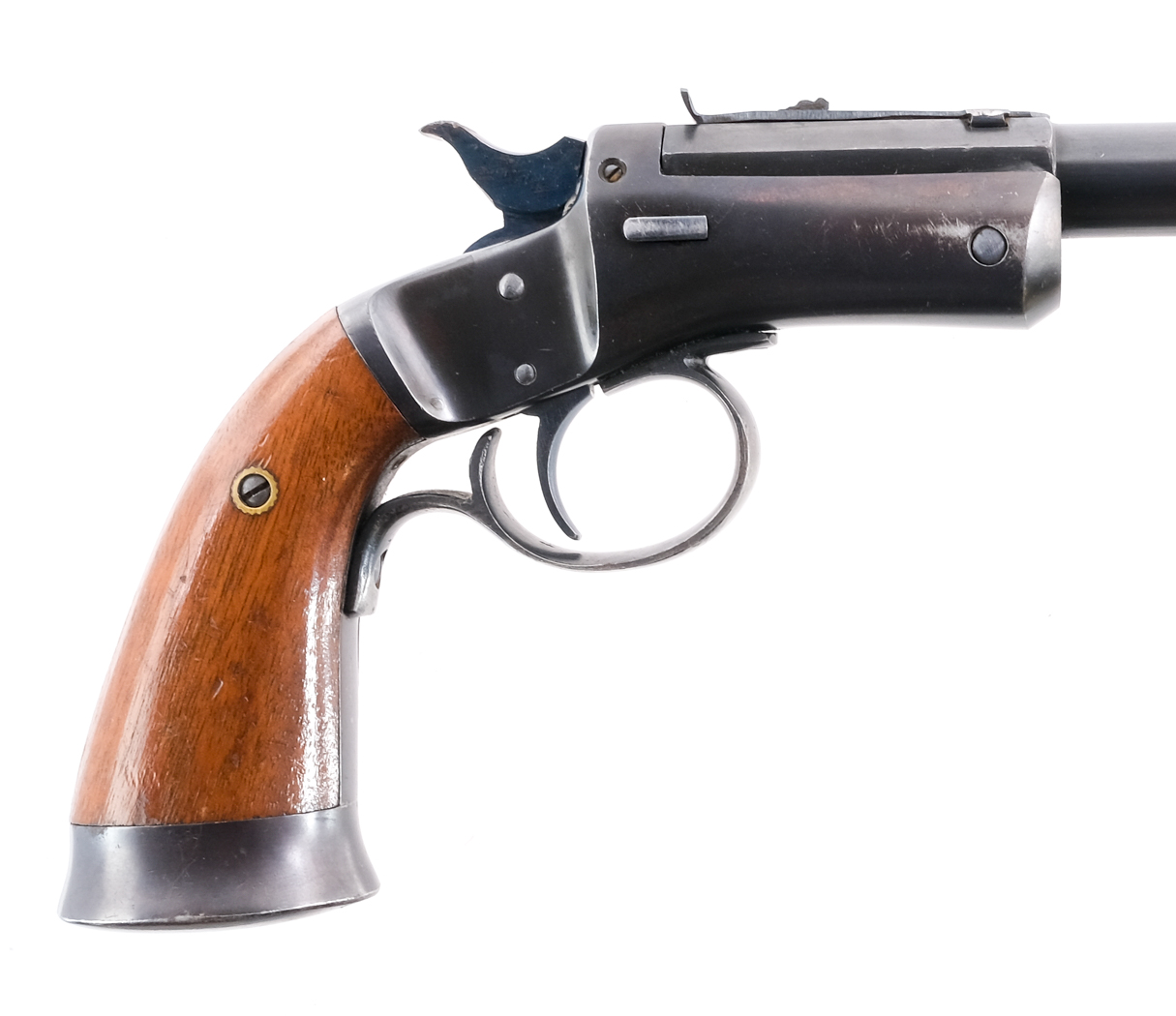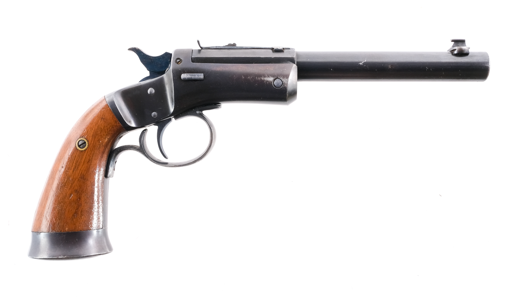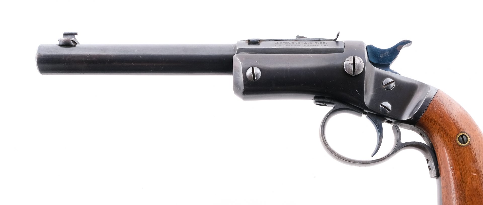 Description J. Stevens A&T Co. Offhand Target No 35 in .22 caliber with a single round capacity and a 6″ barrel. Smooth wood grip plates. Blued trigger guard, frame, untextured trigger, checkered hammer and barrel. Left side of frame barrel tip up button. Rear adjustable and front fixed blade sight. Must ship to a C&R or FFL holder. Condition: Good with the pistol being re-blued, light scratches and handling wear. Clean rifled bore. Barrel Length: 6″ Serial: 48267 Manufacturer: J Stevens A&T Co Caliber: .22 Model: Offhand Target No 35 Book# 9-705