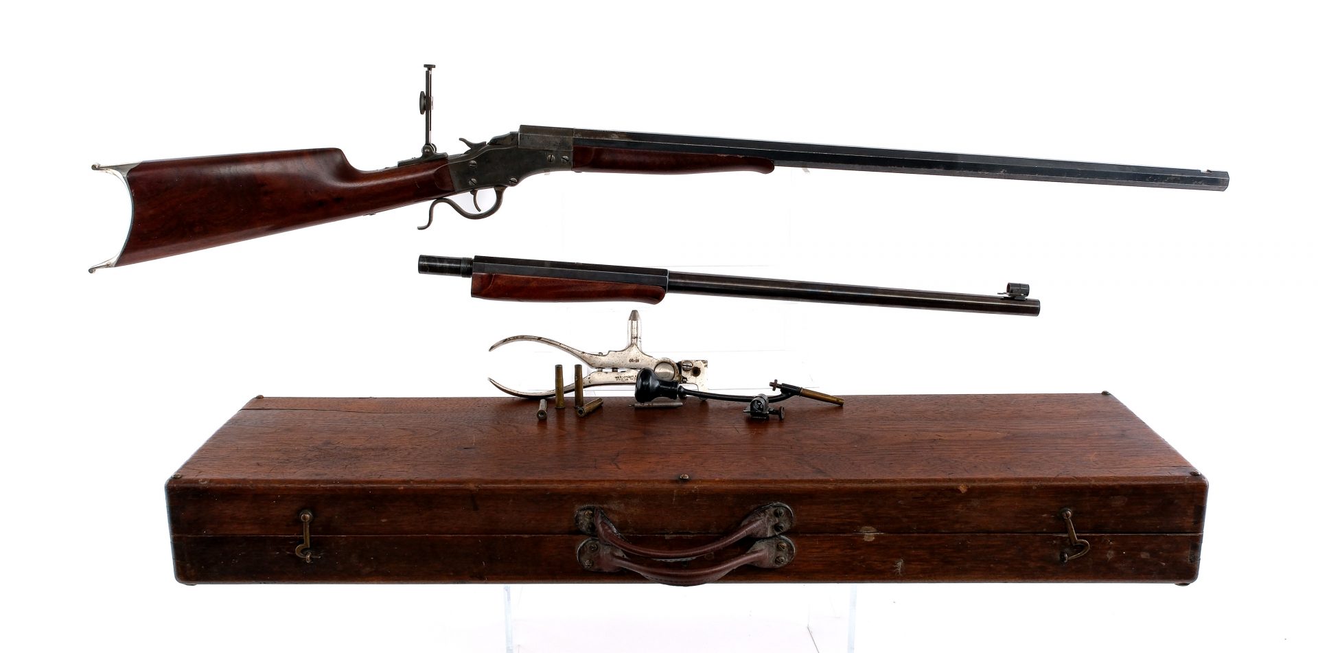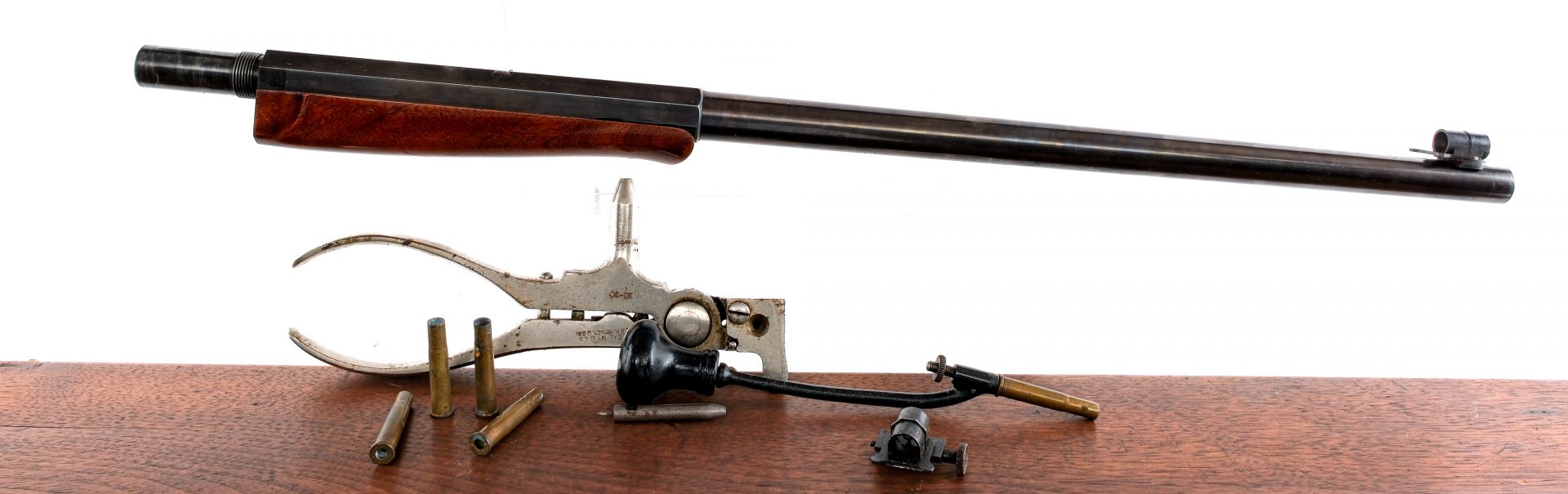 Description UPDATE: The extra 24″ barrel is in .22 Long Rifle. J. Stevens Take-Down Rifle in .25-20 with a single round capacity and two barrels interchangeable. One half octagon/round in 24″ and one full octagon in 28″. Contoured metal butt plate. Smooth wood stock and Schnabel style front forend on each barrel. Finish worn case colored hand lever, trigger, hammer and receiver. Blued barrels. Rear flip up adjustable peep hole and front globe sights. Comes in a custom aftermarket made box with Ideal bullet mold, two barrels, front adjustable sight for one barrel and loading tools. Antique, No FFL required and ships to MOST buyers homes. Condition: Antique Good/Very Good with scratches, finish wear/loss, rust/pitting and small wood crack on the octagon barrel forend. Both barrels have clean rifled bores. Barrel Length: 24″ 28″ Serial: 309 Manufacturer: J. Stevens A&T Co Caliber: 25-20 Model: Take Down Rifle