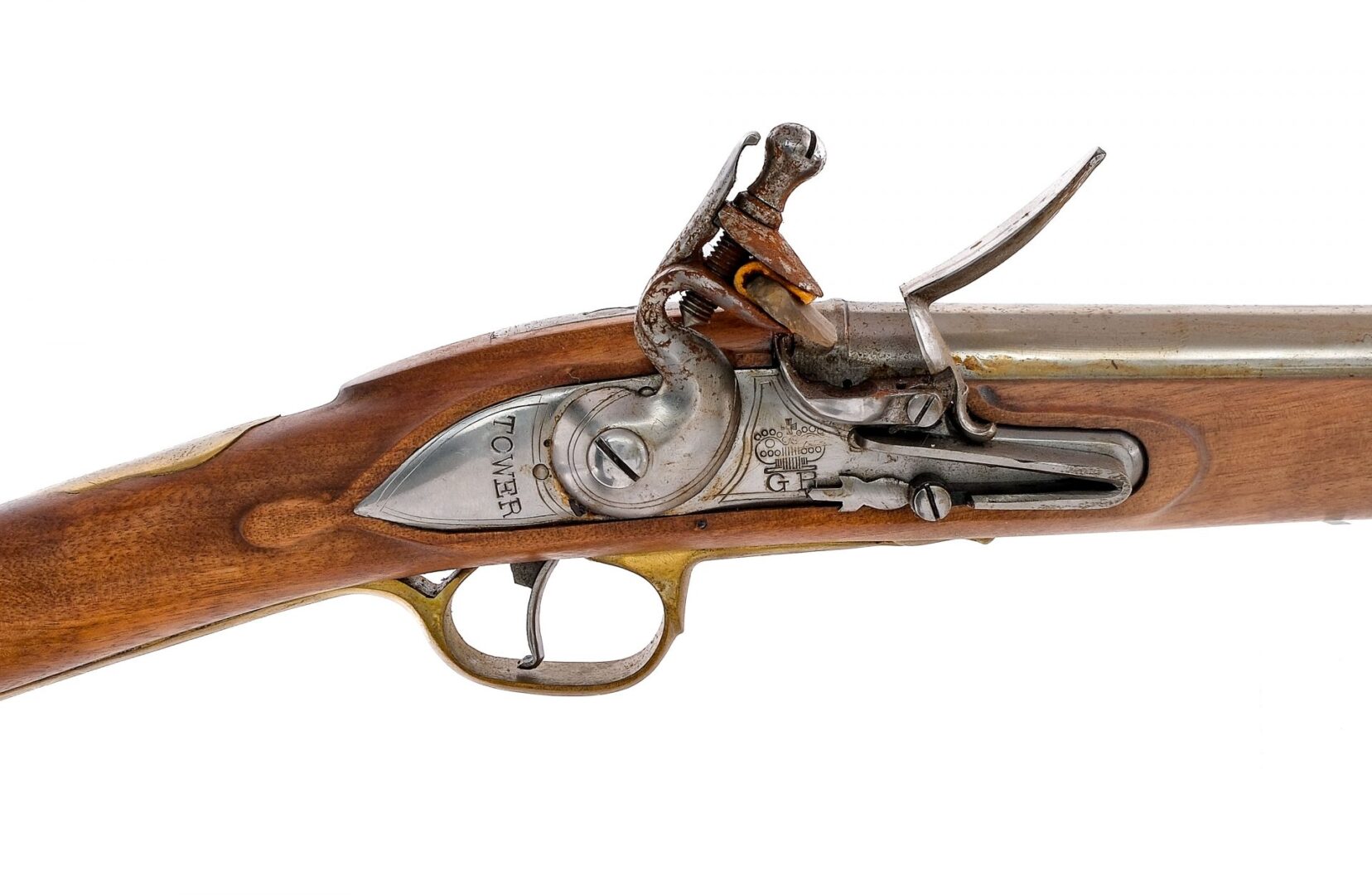 Description Japanese made reproduction of a English Tower flintlock (Brown Bess) measuring in at the bore .75″ with a single round capacity and a 41.5″ smooth bore barrel. Brass butt plate. Full length smooth wood stock. Brass trigger guard, side plate and front barrel cap. Unfinished stainless steel trigger, lock plate, hammer, frizzen and barrel. Under barrel removable ramrod. Lock marked Tower and G.R. Comes with a India marked bayonet and scabbard with shoulder strap. Black Powder Muzzle Loading Flintlock, No FFL required and ships to MOST buyers homes. Condition: Good/Very Good with scratches, finish wear and light rust. Clean smooth bore. Barrel Length: 41″ Serial: 6118 Manufacturer: Japan Caliber: .75″ Model: Brown Bess Tower