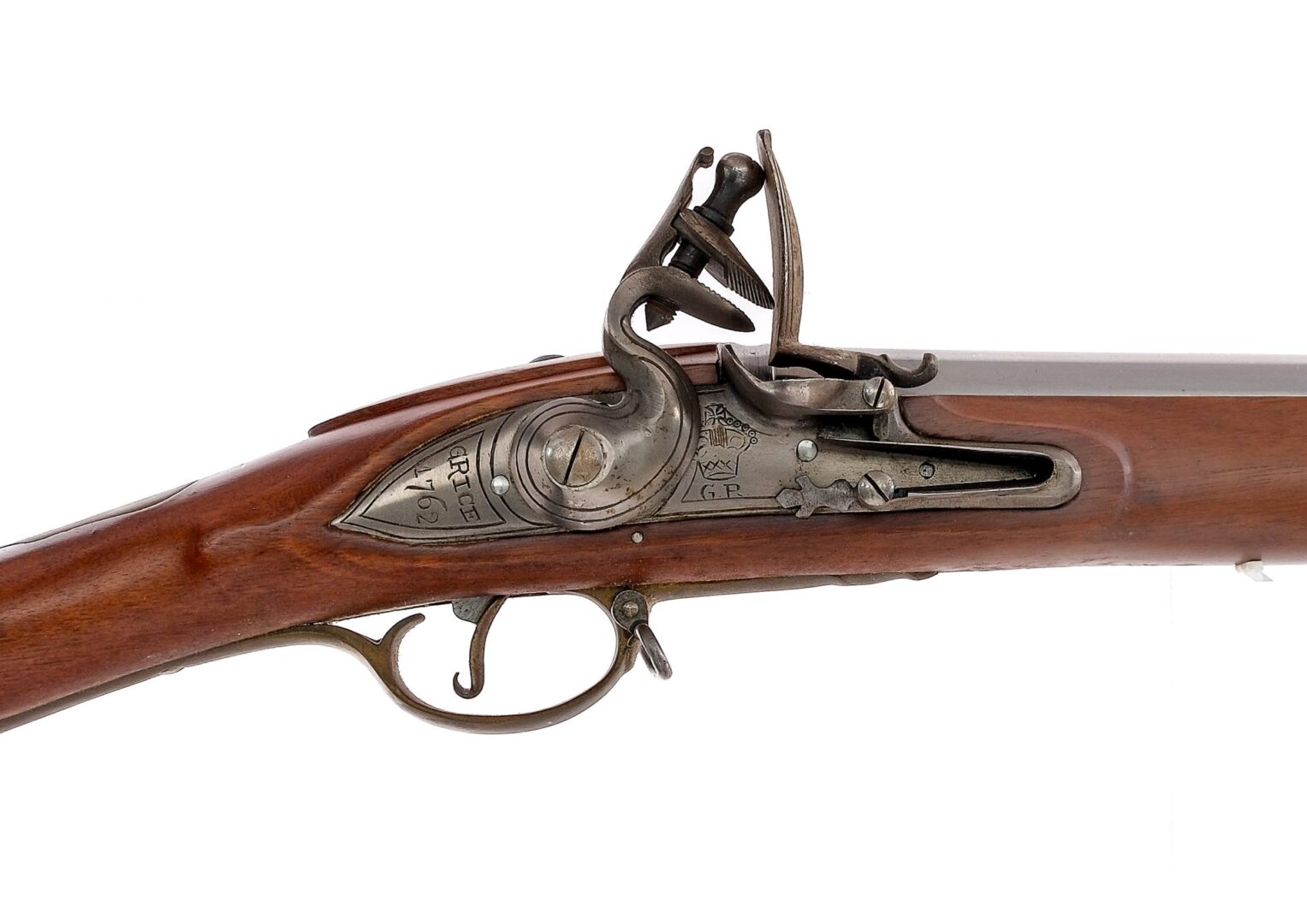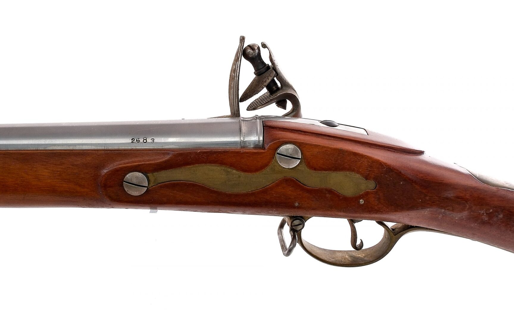 Description Japanese made reproduction of a English Tower flintlock (Brown Bess) measuring in at the bore .75″ with a single round capacity and a 41.5″ smooth bore barrel. Brass butt plate. Full length smooth wood stock. Brass trigger guard, side plate and front barrel cap. Unfinished stainless steel trigger, lock plate, hammer, frizzen and barrel. Under barrel removable ramrod. Lock marked G.R. Grice 1762. Comes with a India marked bayonet. Black Powder Muzzle Loading Flintlock, No FFL required and ships to MOST buyers homes. Condition: Good/Very Good with scratches, finish wear and light rust. Bayonet does not fit to rifle properly and needs fitment. Clean smooth bore. Barrel Length: 41.5″ Serial: 2683 Manufacturer: Japan Caliber: .75″ Model: Brown Bess Tower