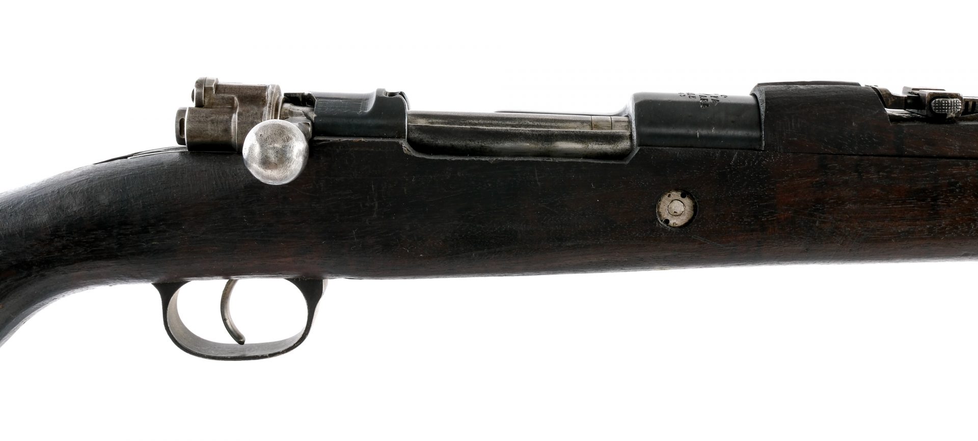 Description K. Kale Turkish Mauser in 8mm with a five round capacity and a 29″ barrel. Metal butt plate. Made in Turkey and import marked by C.A.I. ST. ALB. VT. Smooth wood stock and front forend. Blued trigger guard, trigger, receiver, bolt and barrel. Rear bolt safety switch. Left side of receiver bolt release. Under barrel removable cleaning rod and fixed bayonet lug. Rear flip up adjustable and front fixed blade sight. Mounted with a leather shoulder sling. Inlaid into the butt stock is the bolt/firing pin disassembly tool. Bolt has mismatched serial number to receiver. Must ship to a C&R or FFL holder. Condition: Good with scratches, wood dings and finish wear/loss. Clean rifled bore. Barrel Length: 29″ Serial: 140557 Manufacturer: K Kale Caliber: 8mm Model: M1938 Book# 05495