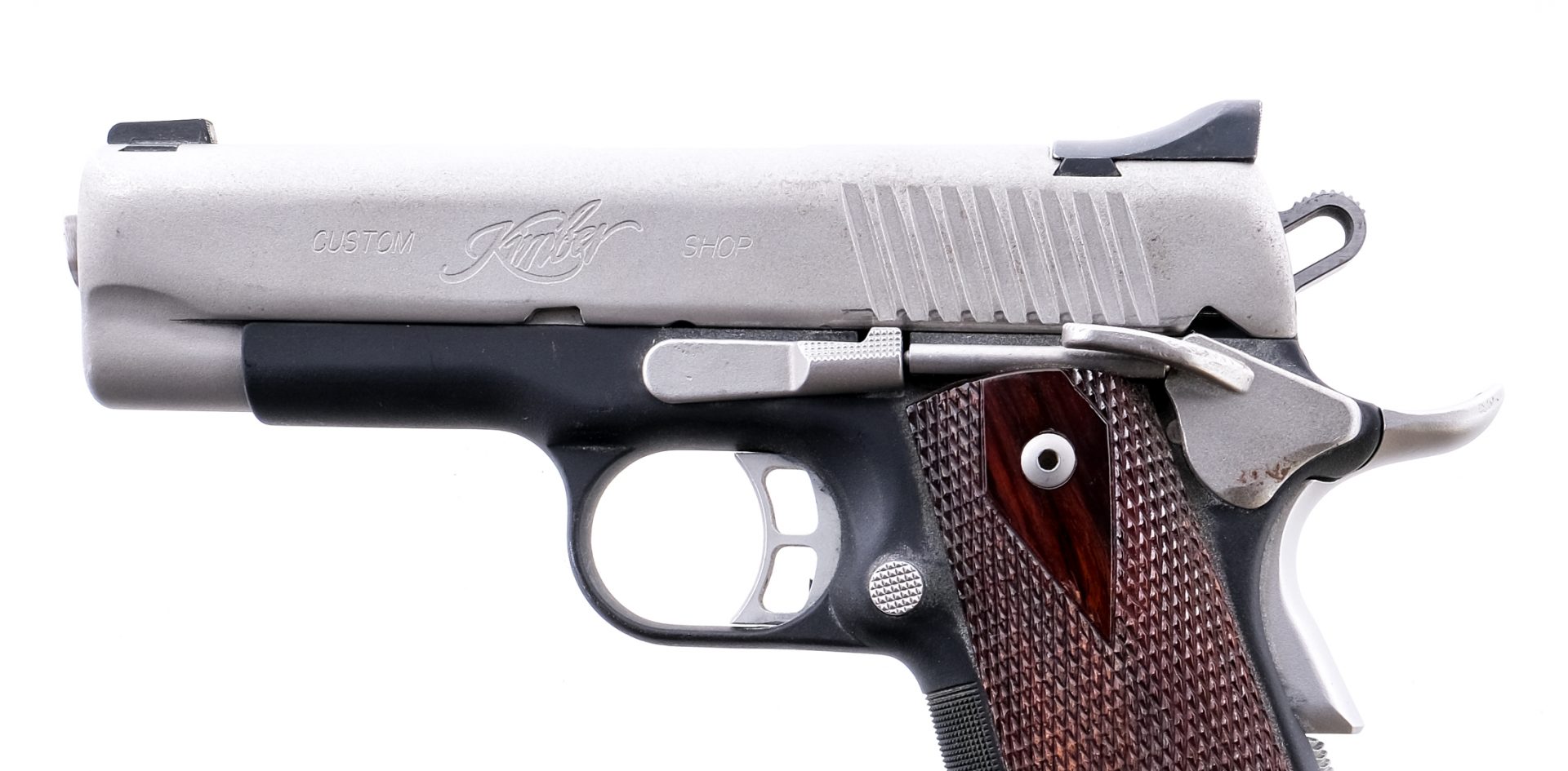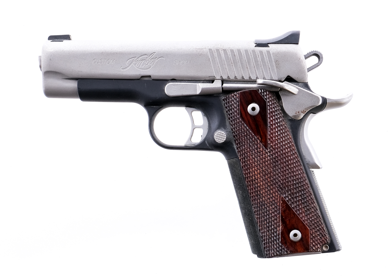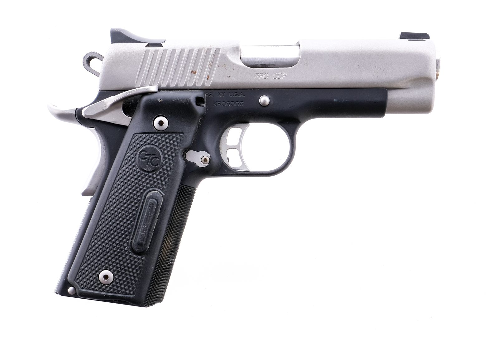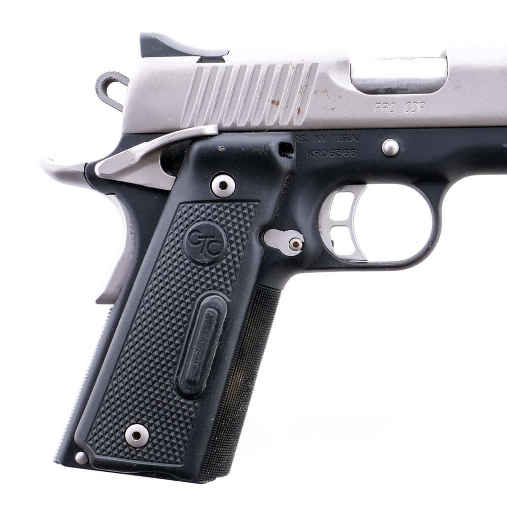 Description Kimber Pro CDP in .45 caliber missing its removable magazine with a 4″ barrel. Checkered wood grip plate on one side and a Crimson Trace laser grip plate on the other. Matte black finished frame. Matte silver finished serrated metal slide. Unfinished stainless steel barrel. Serrated skeletonized trigger and serrated hammer. Lower left side of frame checkered magazine release. Left side of frame checkered slide release. Rear frame located ambidextrous safety switch. Front and rear fixed night sights. Backstrap safety. Must ship to a FFL holder. Condition: Good with scuffs, small spots of rust and handling wear. Clean rifled bore. Barrel Length: 4″ Serial: KR06366 Manufacturer: Kimber Caliber: .45 ACP Model: Pro CDP Book# 9-800