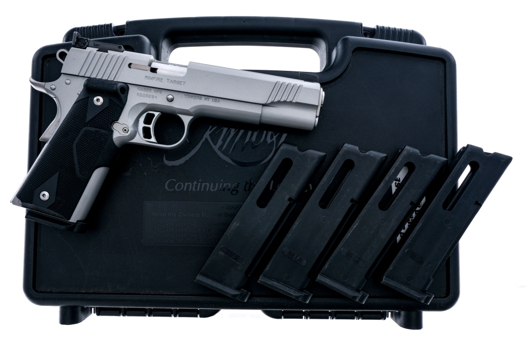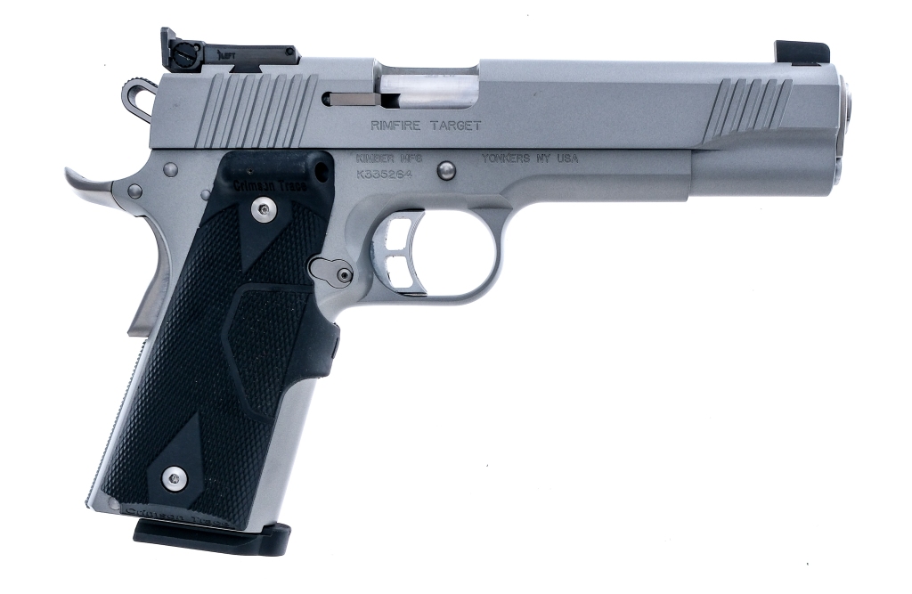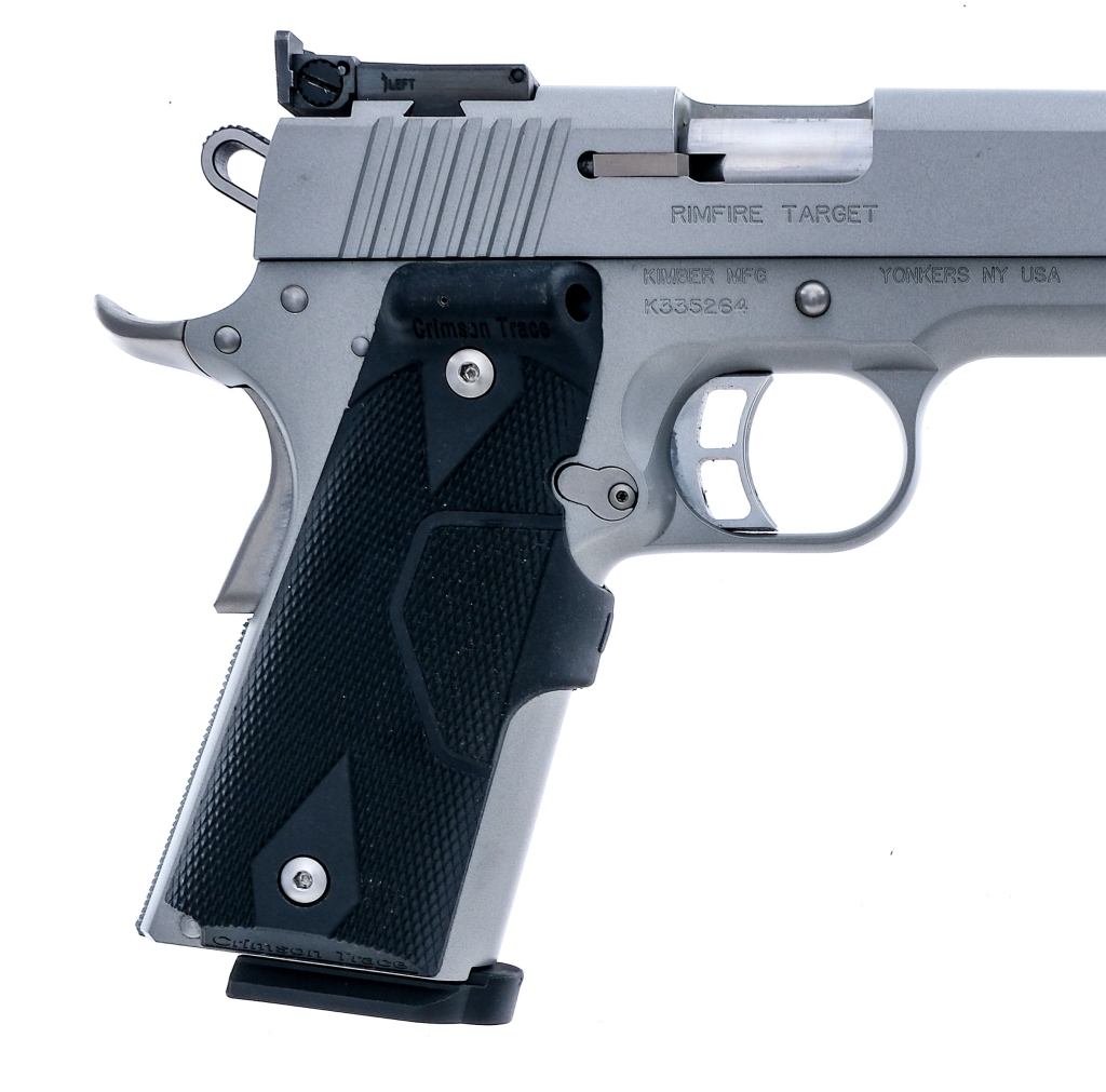 Description Kimber Rimfire Target chambered in .22 long rifle with five, ten round removable magazines and 5.25″ barrel. Checkered Crimson Trace laser dot grip-working. Serrated skeletonized trigger and hammer. Silver finished anodized frame and serrated slide. Left side of frame checkered magazine release, slide release and rear safety. Adjustable rear and fixed front blade sight. Comes in its factory box with matching serial number, factory paperwork, bushing tool, and five magazines. Must ship to FFL holder. Condition: Excellent with light handling wear. Clean rifled bore. Barrel Length: 5.25″ Serial: K335264 Manufacturer: Kimber Caliber: .22 LR Model: Rimfire Target Book# 08387