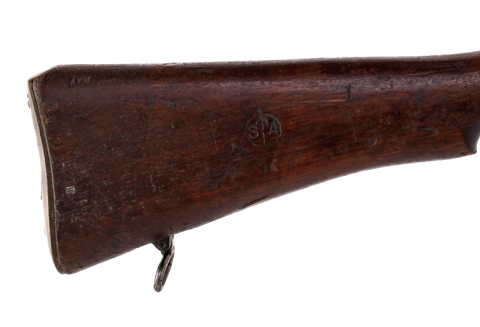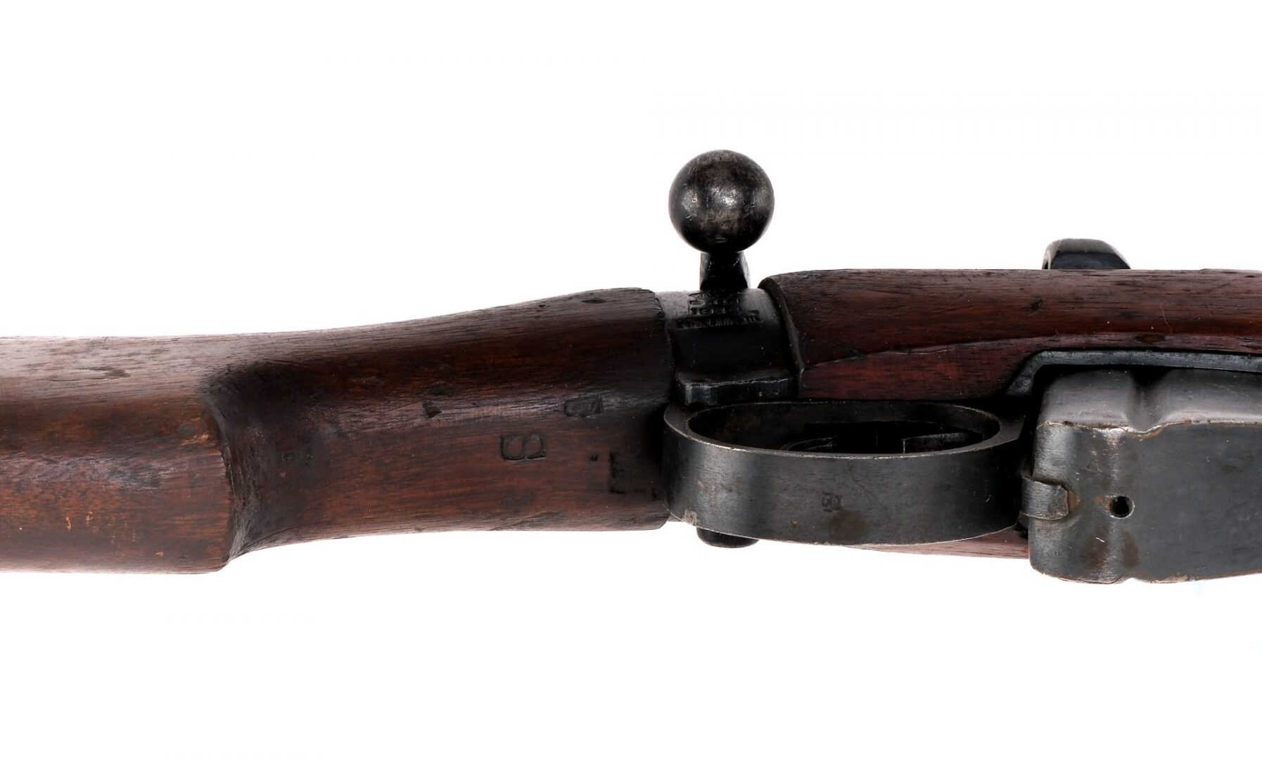 Description Ishapore G.R.I. Lee-Enfield No 1 MK III in .303 British with one, ten round removable magazine and a 25″ barrel. Brass butt plate with trapdoor for cleaning kit, empty. Blued trigger guard, serrated trigger, receiver, bolt and barrel. Rear left side of receiver serrated safety switch. Inside trigger guard magazine release. Under barrel fixed bayonet lug. Rear flip up adjustable and front fixed blade sight. Metal loops for mounting a shoulder sling. Matching serial number on bolt, receiver and underside of wood stock. Right side of butt stock marked: SA with up-arrow. Underside of wrist marked: S P. Underside of forend marked: W over 2. Under side of very front forend marked with serial number matching to receiver, S over 14, ISR10. Must ship to a C&R or FFL holder. Condition: Good with scratches, finish wear, wood dings, wood splices on the top rear barrel cover and handling wear. Clean rifled bore. Barrel Length: 25″ Serial: 41313 Manufacturer: GFI/RFI India Year: 1944 Caliber: .303 British Model: No I MK III Book# 03952