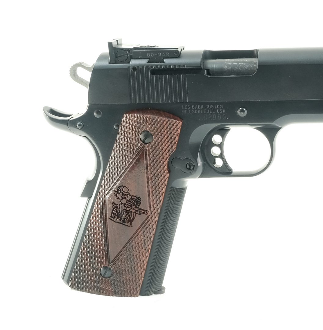 Description Les Baer Light Weight Government Model in .22 LR with (3) ten round removable magazines and a 5″ barrel. All weather BEAR COAT (Teflon-S) finished frame and serrated slide. Aluminum 1911 frame. Les Bauer checkered wood grip plates. Skeletonized serrated hammer and serrated adjustable trigger. Beavertail depression grip safety. Left side of frame checkered slide release and slide stop safety switch. Lower left side of frame serrated magazine release button. Adjustable rear BO-MAR and front fixed blade sights. Comes in its factory box with matching serial number, three magazines and factory instruction booklet. Must Ship to FFL or C&R holder