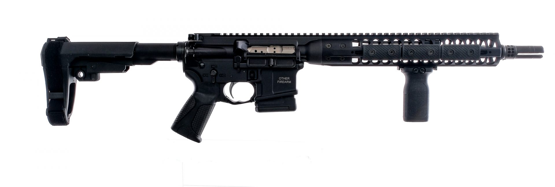 Description LWRC International M6IC DI Oscar Foxtrot chambered in 5.56 with one, ten round removable magazine and a 13″ 1-7 twist cold hammer forged NiCorr heavy barrel with a Surefire war comp three prong flash hider. LWRCI 12″ handguard with full length top picatinny rail and side/bottom MLOK rails with side rail covers and a Magpul RVG vertical grip. Forged aluminum flat top monoforged upper with ambidextrous charging handle and nickel boron plated bolt carrier group. LWRCI ambidextrous lower receiver with ambidextrous selector, magazine release, and bolt catch. Right side of the magazine well is marked “OTHER FIREARM”. Textured LWRCI pistol grip and adjustable SB tactical SBA3 pistol brace. Must ship to a FFL holder. Check local laws regarding “Assault Weapons” BEFORE bidding, NOT CT legal. Condition: Very Good/Excellent with light scratches and scuffs from handling and storage. Bright and clean bore with strong rifling. Barrel Length: 13″ Serial: 25-04929 Manufacturer: LWRC INTERNATIONAL, INC. Caliber: 5.56x45mm NATO Model: M6IC DI Oscar Foxtrot Book# 03212