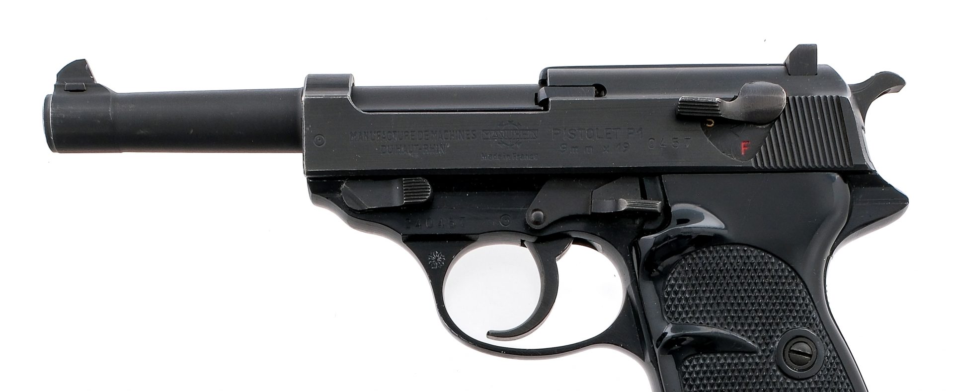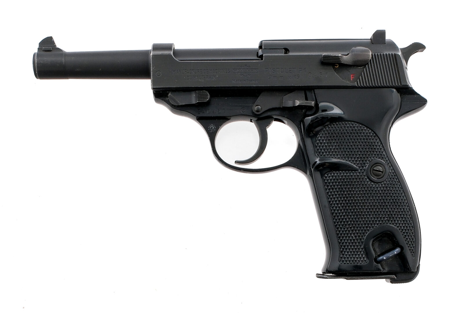 Description Manurhin P1 in 9mm with one, eight round removable magazine and a 5″ barrel. Made in France. Checkered black composite grip plates. Blued frame, trigger, serrated hammer, serrated slide and barrel. Magwell located serrated magazine release. Left side of grip lanyard loop. Left side of frame serrated slide release and take-down lever. Rear left side of slide serrated safety switch. Front and rear fixed sights. P38 marked magazine, with mismatched serial number on bottom of magazine. Must ship to a FFL holder. Condition: Very Good/Excellent with light scuffs and handling wear. Clean rifled bore. Barrel Length: 5″ Serial: 240457 Manufacturer: Manurhin Caliber: 9mm Model: P1 Book# 02352