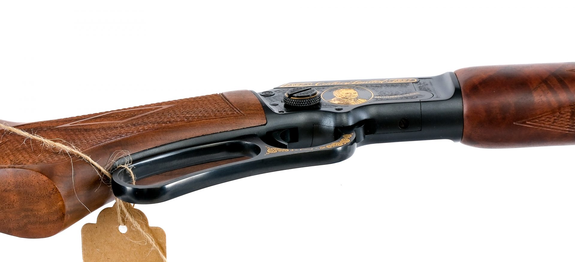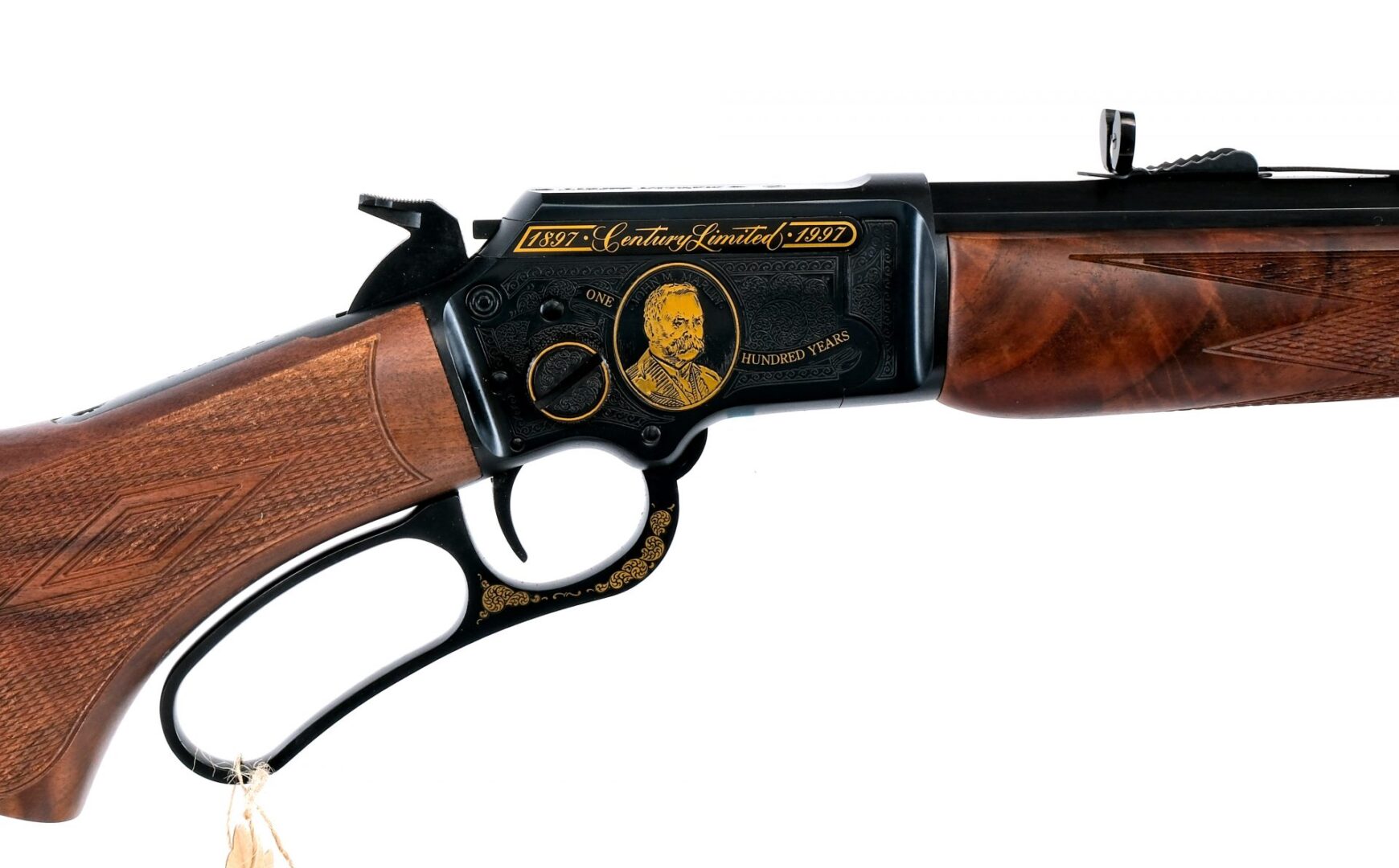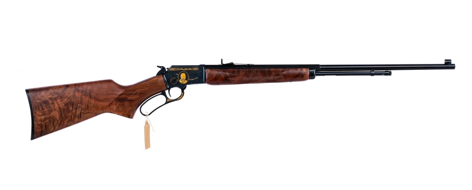 Description JM stamped Marlin 1897 Century Limited chambered in .22 short, long, and long rifle with a varied capacity tubular magazine and a 24″ half octagonal barrel. This rifle was personally owned by Robert W. Behn, president of Marlin from 1997 to 2010. Serial number 18970003. Comes with notarized paper signed by Robert. Blued barrel, magazine tube, receiver, lever, trigger, and hammer. The receiver, bolt, and lever are scroll engraved with gold inlay. The right side is marked “1897 Century Limited 1997” “One Hundred Years” with a photo of John M Marlin. Cross bolt safety. Checkered wood forend and pistol grip stock with checkered butt plate. Adjustable rear buckhorn sight and fixed front blade. Comes in its factory box, factory paperwork, and provenance. Must ship to a FFL holder. Condition: New old stock in box. Barrel Length: 24″ Serial: 18970003 Manufacturer: MARLIN FIREARMS COMPANY Caliber: .22 Short, Long, Long Rifle Model: 1897 Century Limited Book# 04174