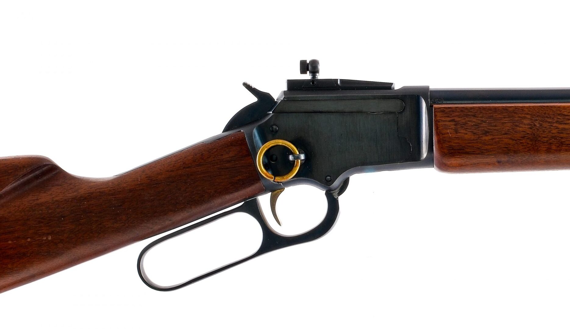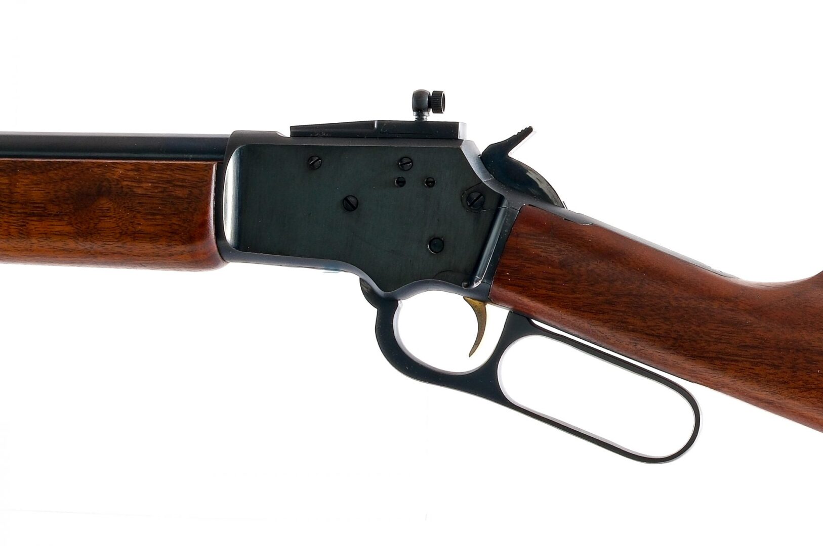 Description Marlin Model 39-A in .22 Short, Long or Long Rifle with a varied capacity and a 20″ barrel. Checkered composite butt plate. Smooth wood stock and front forend. Blued hand lever, receiver, hammer, magazine tube and barrel. Gold finished trigger. Right side of receiver saddle ring. Under barrel checkered magazine tube knob. Rear aftermarket Skinner peep hole and front fixed fiber optic sight. Mounted with a leather shoulder sling. Must ship to a C&R or FFL holder. Condition: Very Good with light scratches and missing the rear barrel sight. Clean rifled bore. Barrel Length: 20″ Serial: P16030 Manufacturer: Marlin Year: 1956 Caliber: .22 S L LR Model: 39A Book# 03817