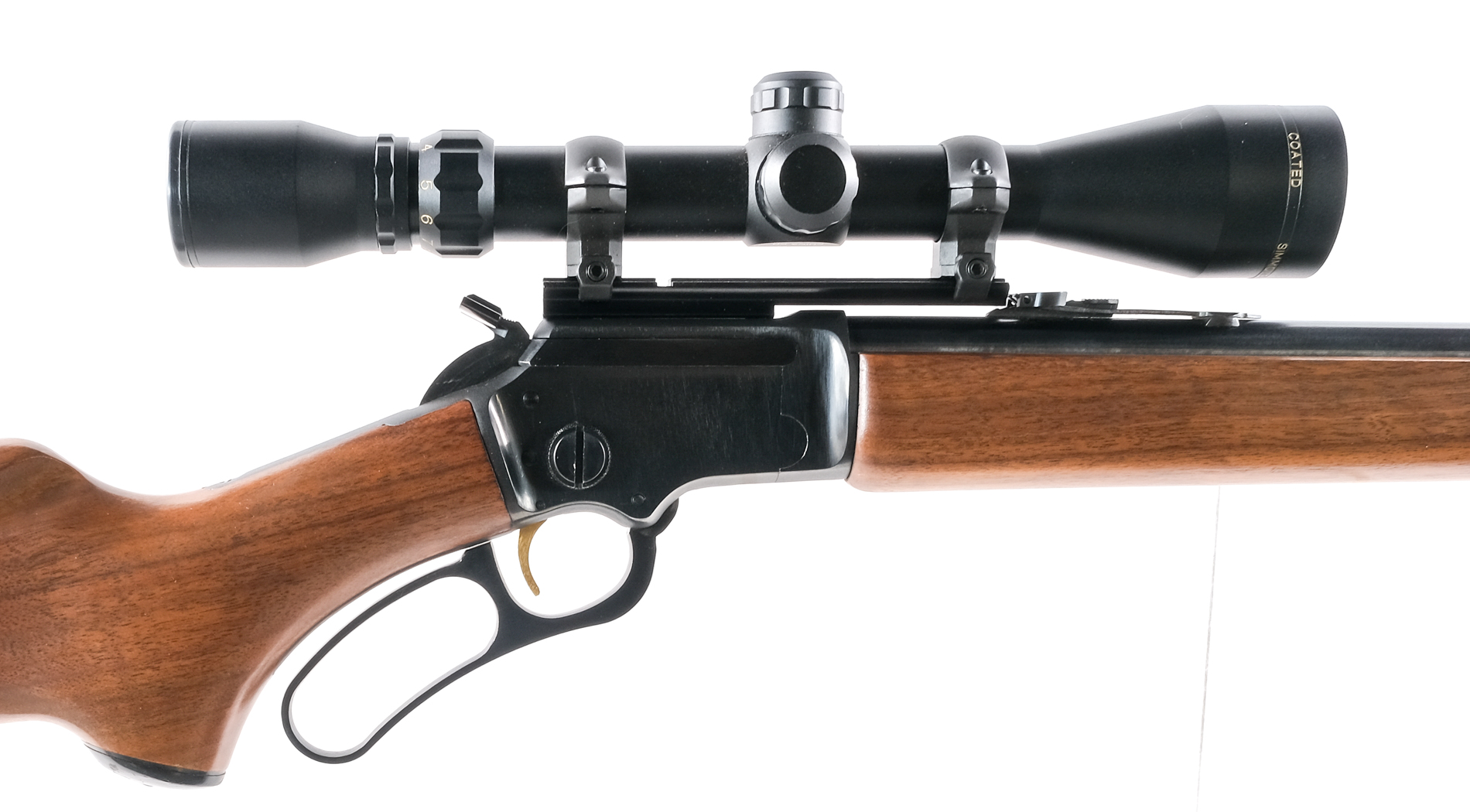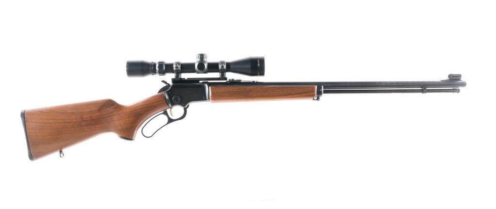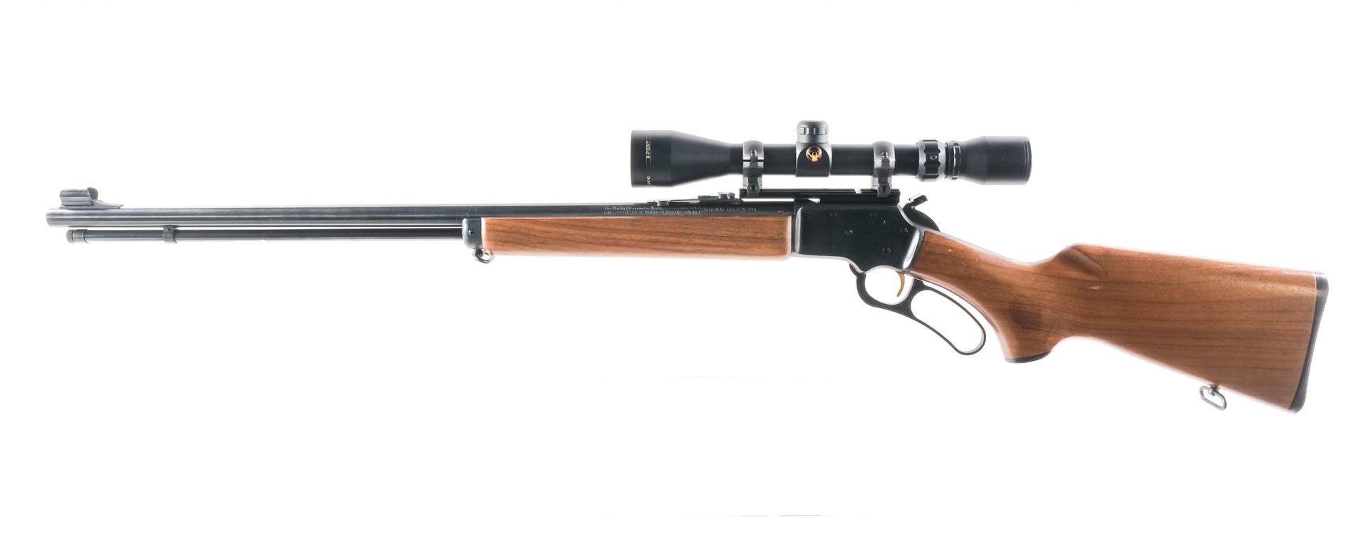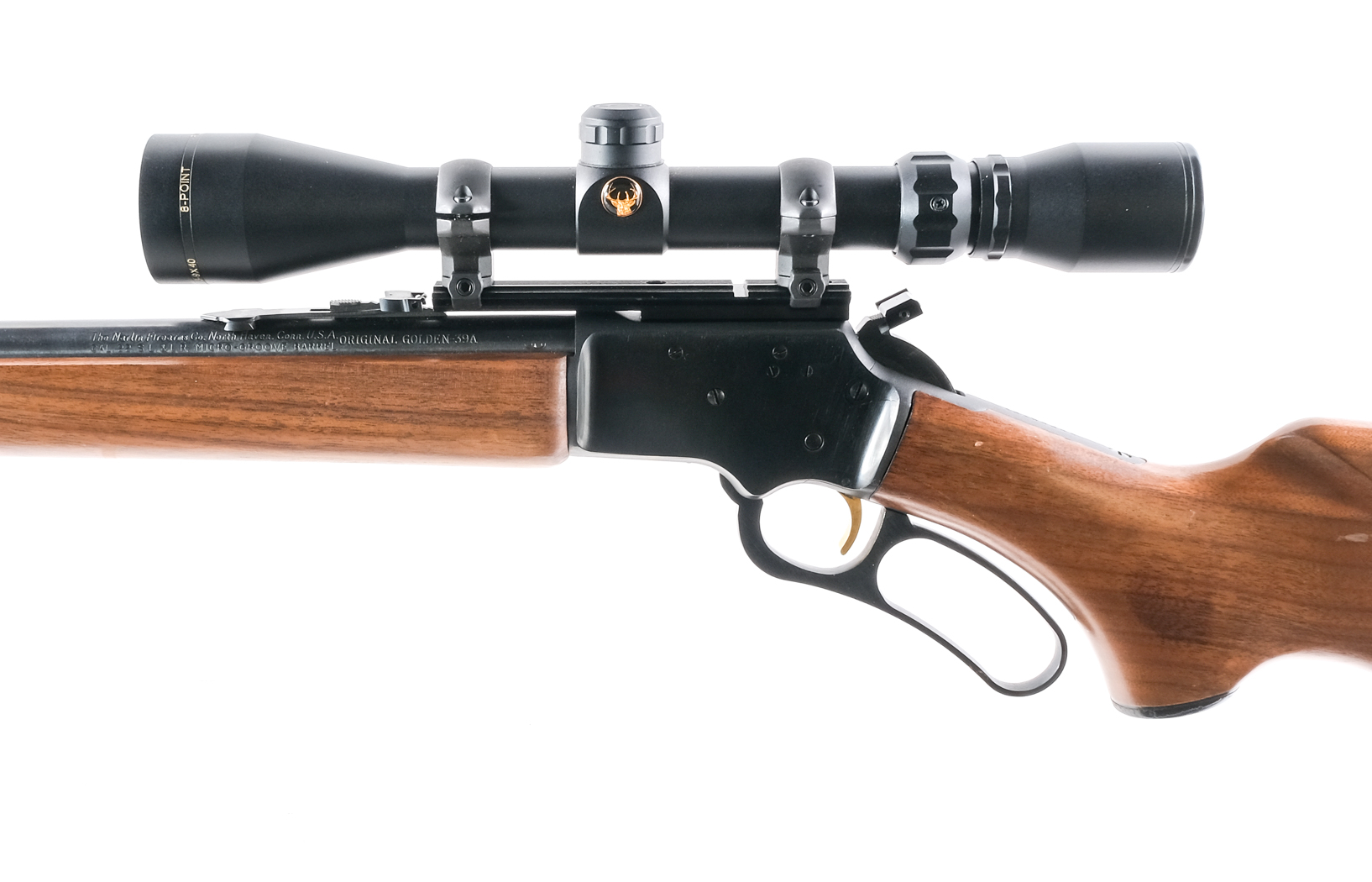 Description Marlin Golden 39A in .22 Short, Long and Long Rifle with a varied capacity and a 24″ barrel. Black checkered composite butt plate. Smooth wood stock and front foregrip. Blued hand lever, hammer, receiver, magazine tube and barrel. Gold finished untextured trigger. Hammer has checkered finger extension. Rear flip up adjustable and front hooded fixed blade sight. Under barrel serrated magazine tube knob. Metal loops for mounting a shoulder sling. Comes mounted with a Simmons 8 Point Fully Coated scope with clear glass and a duplex reticle. Must ship to a FFL holder. Condition: Very Good with light scuffs and handling wear. Clean rifled bore. Barrel Length: 24″ Serial: 23256392 Manufacturer: Marlin Caliber: .22 S L LR Model: 39A Book# 9-608