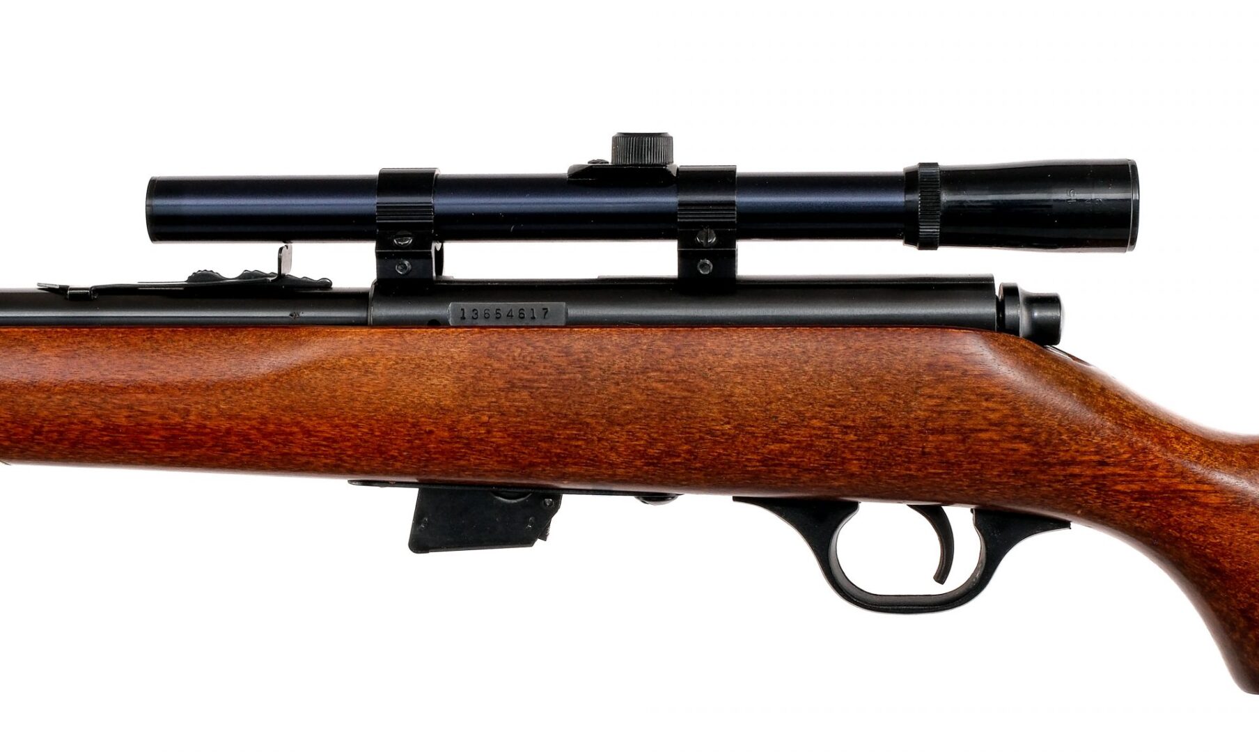 Description Marlin model 25 chambered in .22 short, long, and long rifle with three removable magazines and a 22″ barrel. Blued barrel, drilled and tapped receiver, bolt, and serrated trigger. Push to fire safety lever. The receiver is mounted with a Tasco 4×15 scope with clear and intact glass. Adjustable rear sight and fixed front blade. Smooth wood pistol grip stock with composite butt plate. Must ship to a FFL holder. Condition: Very good/Excellent with very light handling wear. Clean and bright rifled bore. Barrel Length: 22″ Serial: 13654617 Manufacturer: MARLIN FIREARMS COMPANY Caliber: .22 Short, Long, Long Rifle Model: 25 Book# 04387