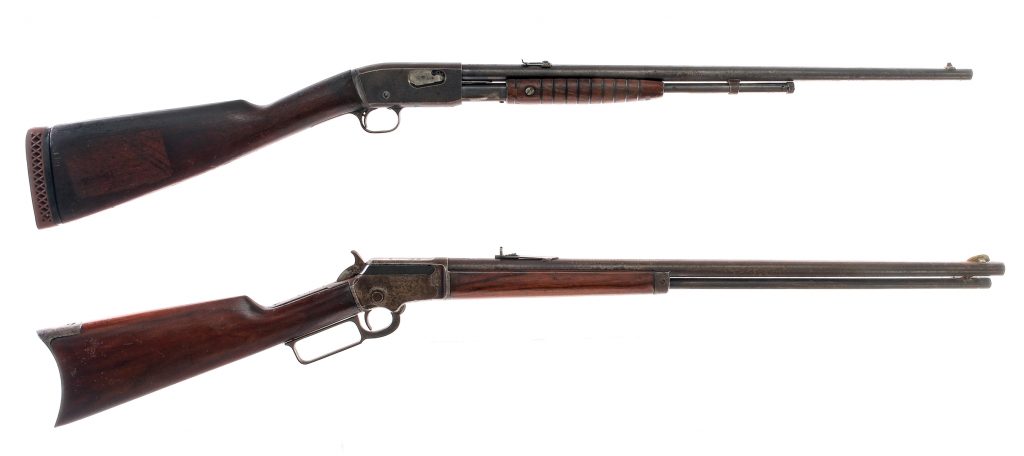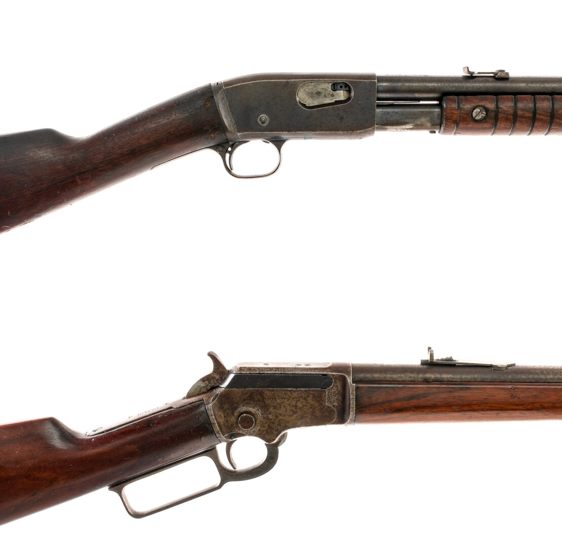 Description Estate rifles with two pieces. Marlin Model 92 in .32 Rimfire with a varied capacity and a 24″ barrel. Smooth wood stock and front foregrip. Finish worn lever, receiver, magazine tube and barrel. Right side of receiver Take-down screw. Rear adjustable and front fixed blade sight. Remington Model 12-A in .22 Short, Long or Long Rifle with a varied capacity and a 22″ barrel. Smooth wood stock and serrated front forend. Blued receiver, magazine tube and barrel. Rear adjustable and front fixed blade sight. Must ship to a C&R or FFL holder. Condition: Fair with scratches, wood damage, finish wear/loss and rust. Both rifles have light rust/pitted rifled bores. Sold AS-IS. Barrel Length: 24″ 22″ Serial: 298550 43339 Manufacturer: Remington Marlin Caliber: .22 S L LR .32 RF Model: 12-A 92 Book# 01741 01723