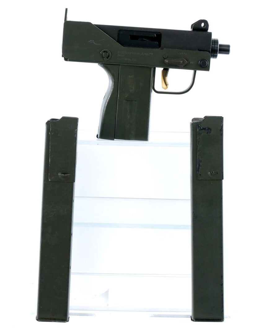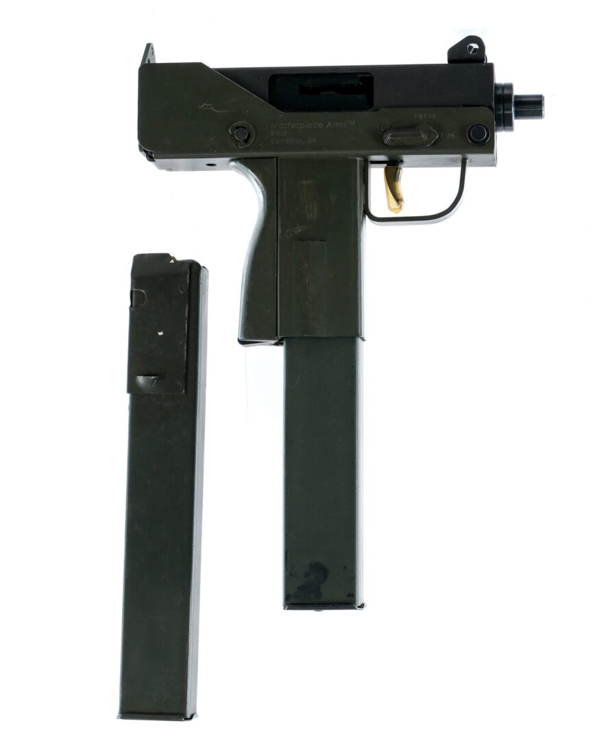 Description MPA, Masterpiece Arms Defender in 9mm with two, thirty round removable magazines and a 3.5″ barrel. Olive drab painted composite back strap grip. Olive drab metal frame. Blued trigger, upper, charging handle and barrel. Magwell located magazine release. Rear peep hole and front fixed blade sight. Right side of receiver safety switch. Comes with two thirty round magazines. Check Local/State Laws on High Capacity Magazines and Assault Weapons Bans BEFORE bidding. Ships to FFL holder. Condition: Good with aftermarket paint, scratches and handling wear. Clean rifle bore. Barrel Length: 3.5″ Serial: F3117 Manufacturer: Masterpiece Arms Caliber: 9mm Model: Defender Book# 05293