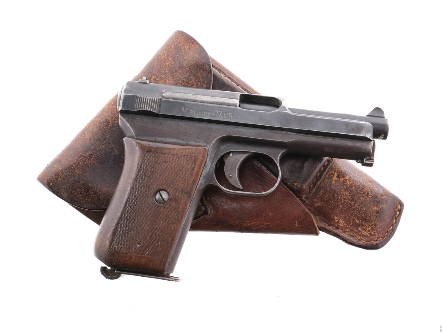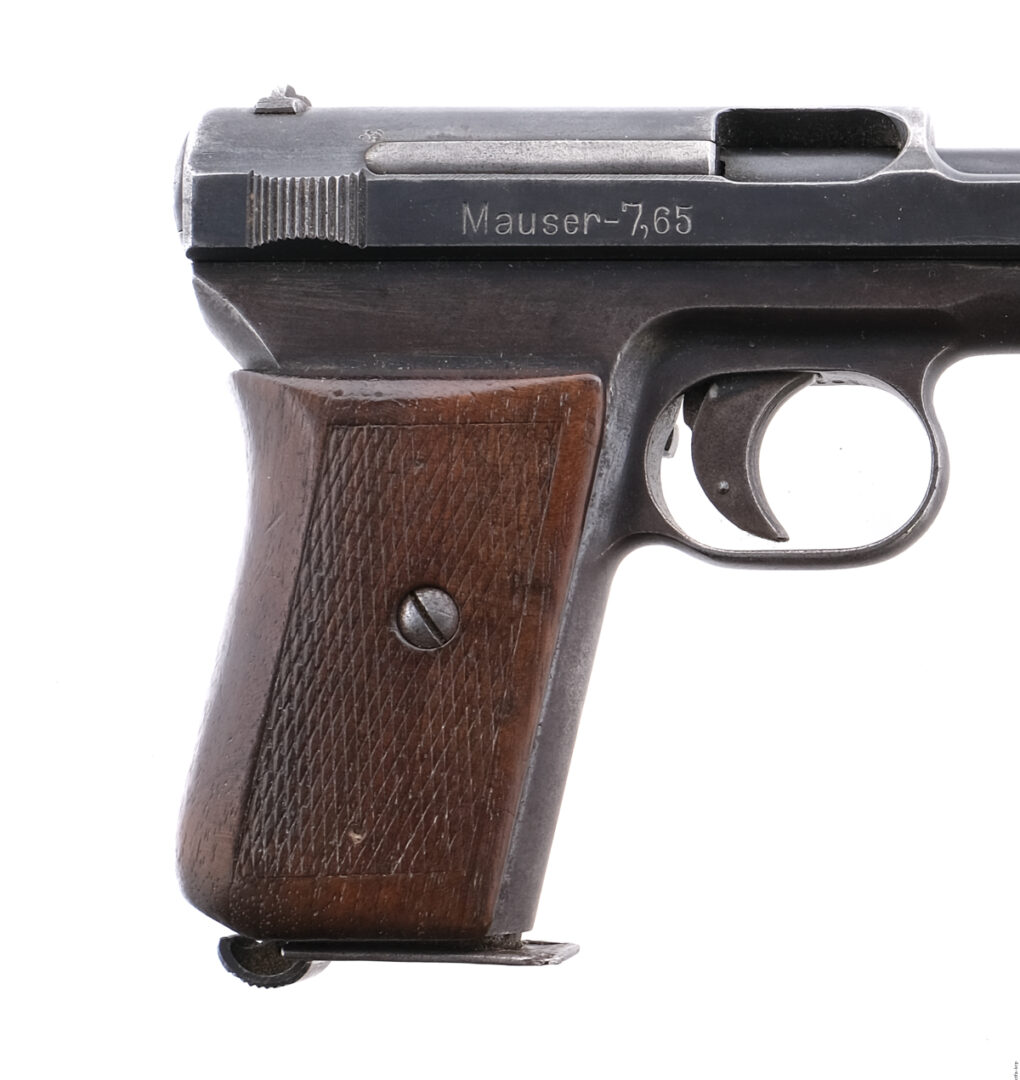 Description Mauser Model 1910/14 in .32 caliber with one, eight round removable magazine and a 3.5″ barrel. Checkered wood grip plates. Blued frame, trigger, serrated slide and barrel. Magwell located serrated magazine release. Left side of frame safety and release. Front and rear fixed sights. Comes in its unmarked fitted leather holster. Must ship to a C&R or FFL holder. Condition: Fair with finish wear/loss, scratches and handling wear. The barrel has a bulge and the rifled bore has rust. Sold AS-IS. Barrel Length: 3.5″ Serial: 289152 Manufacturer: Mauser Caliber: .32 ACP Model: 1910/14 Book# 455