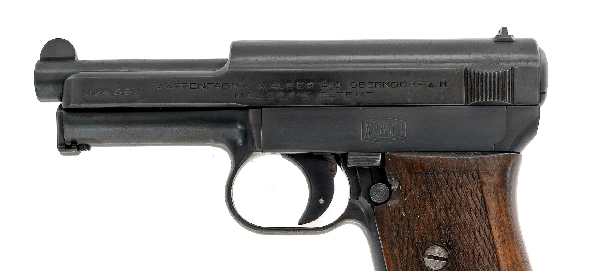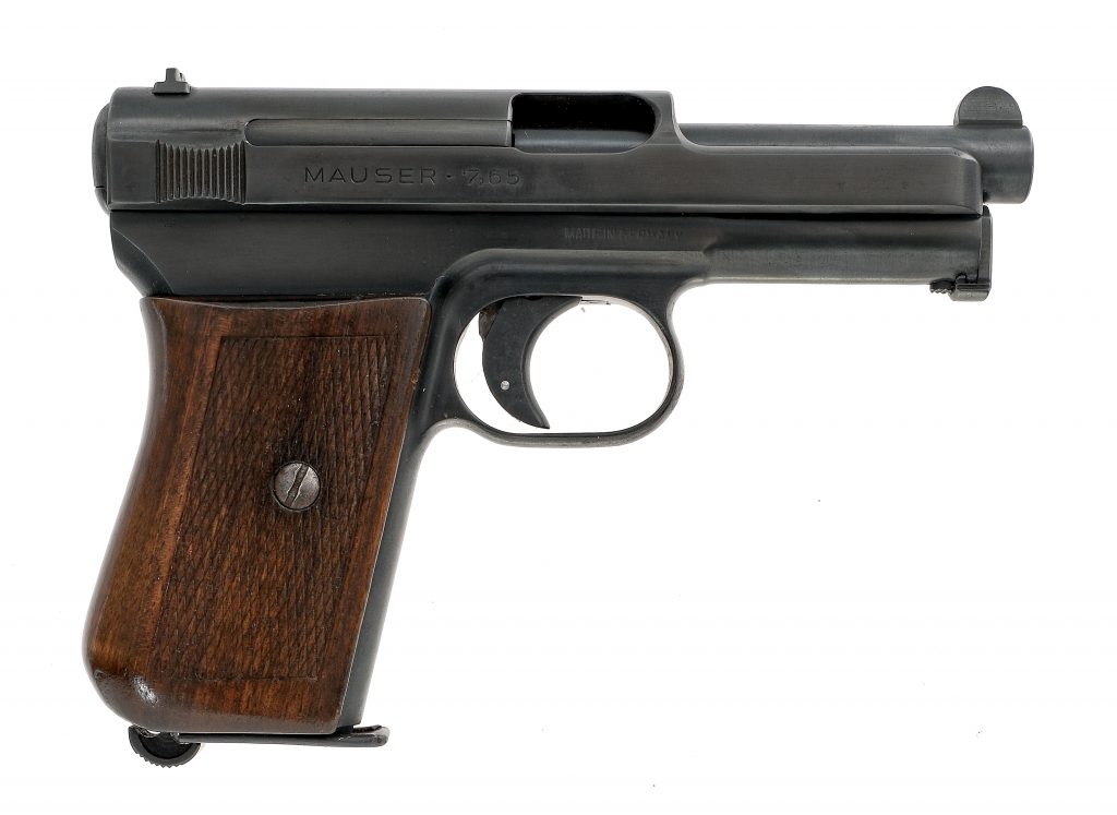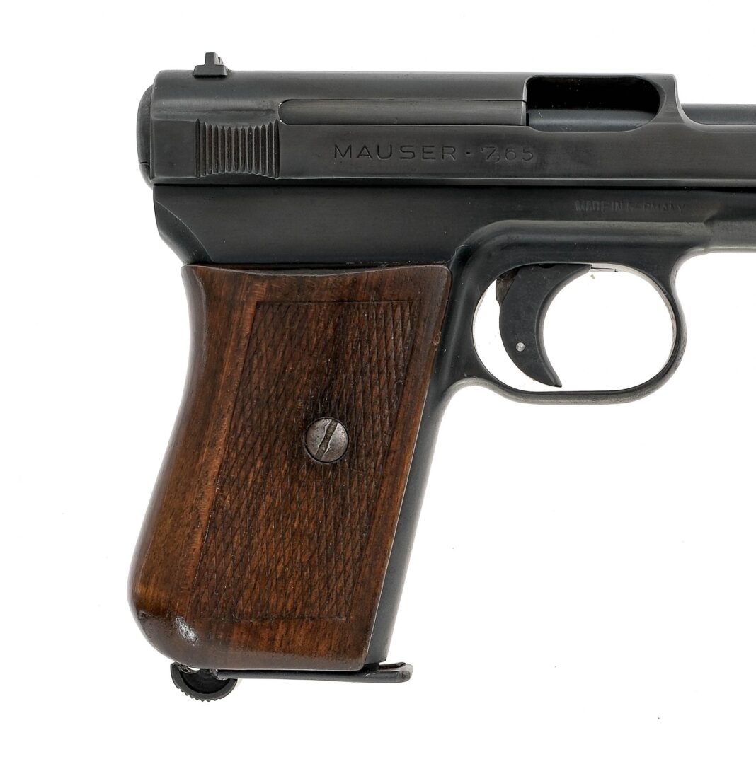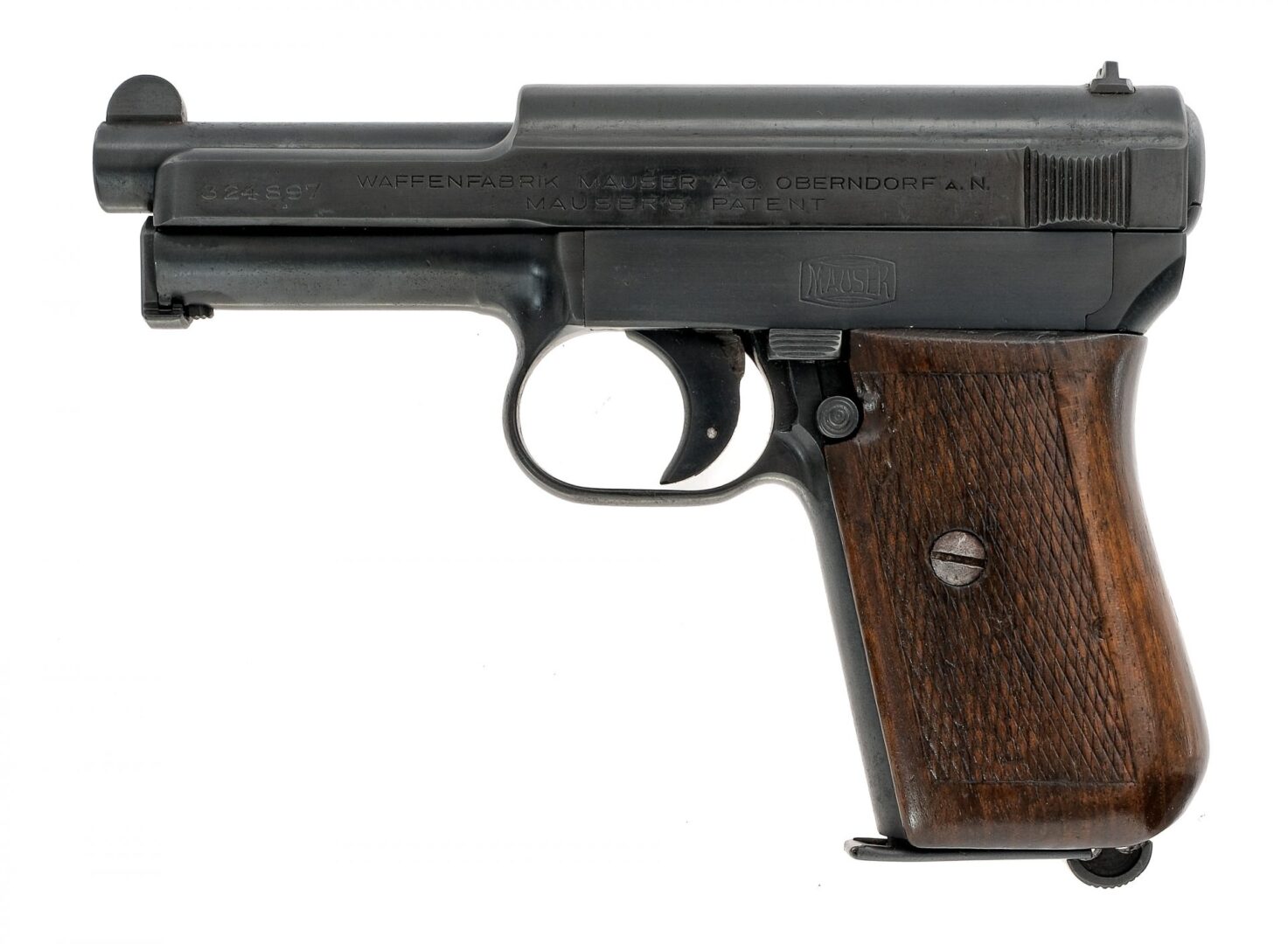 Description Mauser 1914 chambered in 7.65mm (.32 ACP) with one, eight round removable magazine and a 3.39″ barrel. Blow back operated handgun manufactured in Germany with serial number 324897. Blued steel frame with a heel magazine release and checkered wood grips. Manual frame mounted thumb safety. Blued serrated slide with cocked striker indicator. Fixed iron sights with V-notch rear sight and fixed front blade. Made in Germany is marked on the right side of the frame and backstrap of the wood grip. Matching barrel, slide, and frame. Must ship to a FFL or C&R holder. Condition: Fair/Good having been reblued with visual buffing marks, pitting under the finish, and some faded lettering/proofs. Small spots of metal oxidation. Light scratches and wear on the grips. Rusty bore with strong visible rifling. Barrel Length: 3.39″ Serial: 324897 Manufacturer: Mauser Caliber: .32 ACP Model: 1914 Book# 03474