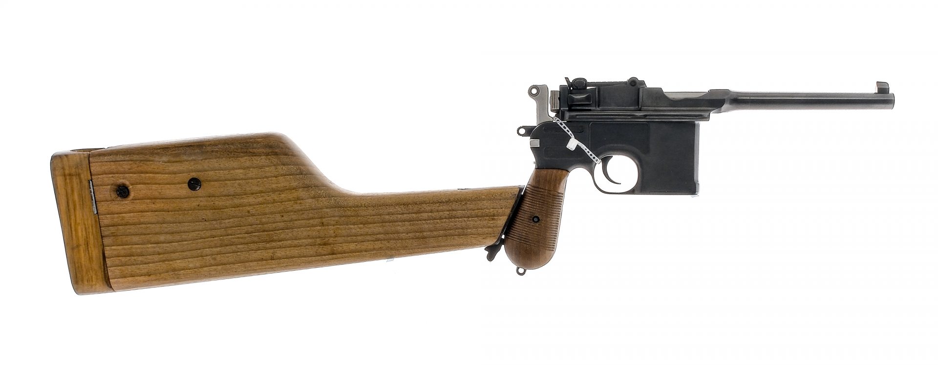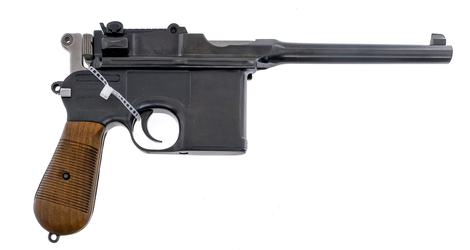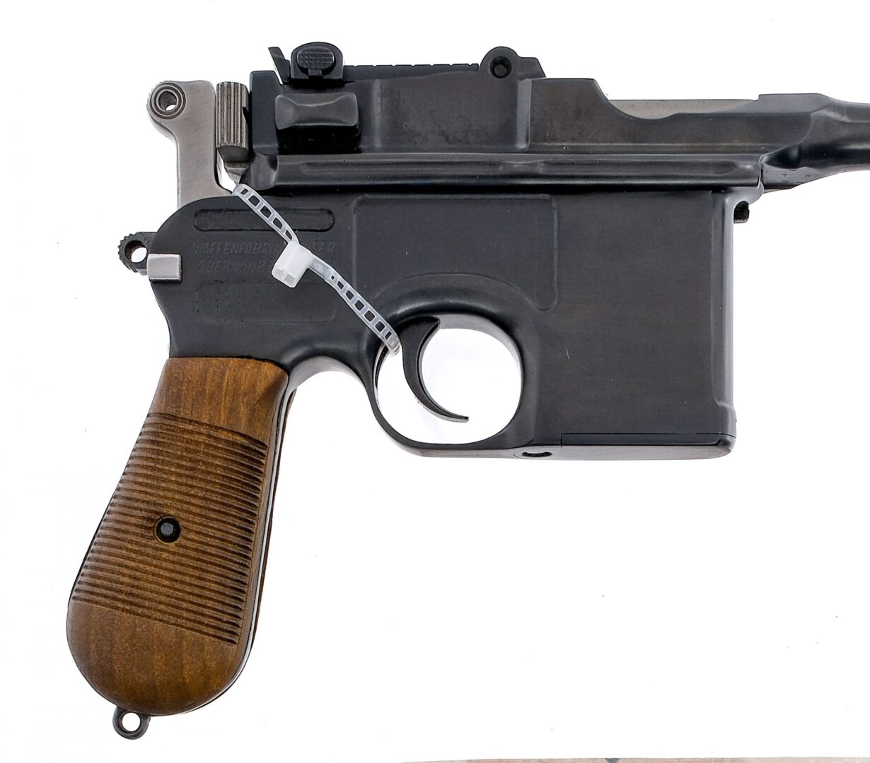 Description Mauser C96 chambered in 7.63x25mm Mauser with a ten round internal clip fed magazine and a 5.5″ barrel. Reblued steel frame with lanyard loop, stock cut, and ribbed wood grip plates. Single action blued trigger and stainless hammer. Manual thumb safety. Blued barrel and slide. Stainless bolt and serrated charging bolt ears. Adjustable rear tangent sight and fixed front blade. The left side of the frame is marked with the Mauser logo. The right side of the frame is marked “WAFFENFABRIK MAUSER OBERNDORF A NECKAR”. Crown “U” proof on the side of barrel extension and bolt. Matching serial number barrel extension, frame, lock, and hammer. The left side of the barrel is marked “7.63 MAUSER”. Comes with an aftermarket reproduction wood shoulder stock/holster. NOT NFA, Must ship to a FFL or C&R holder. Condition: Good/Very Good having been refinished and restored, with some visible clean buffing marks and spots of pitting under the finish ,mainly on the milled parts of the frame. The refinish is well done and the lettering/proofs are still crisp. Aftermarket grips are proud of the frame. The grip frame has heavy metal oxidation/pitting and appears to not have been buffed as much as the other parts due to the thinner metal. Appears to have a replacement barrel with a bright and clean bore with strong rifling. Barrel Length: 5.5″ Serial: 337675 Manufacturer: Mauser Caliber: 7.63x25mm Mauser Model: C96 Book# 02324