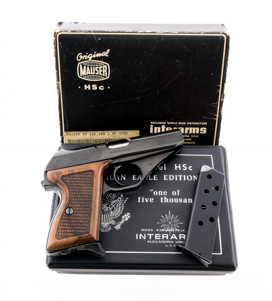 Description Mauser HSc American Eagle limited edition chambered in .380 ACP with one, seven round removable magazine and a 3.4″ barrel. This pistol is #2387 of only 5000 made. Made in Germany and imported by Interarms out of Virginia. Checkered wood grip plates. Blued frame, serrated hammer, smooth trigger and serrated slide. Left side of slide serrated safety switch. Serrated heel magazine release. Fixed iron sights. Marked with American Eagle on right side of the slide. Comes in factory case marked “one of five thousand” with original cardboard sleeve with matching serial number. Included in the box is the manual and test fire target. Must ship to FFL holder. Condition: Very good/Excellent with light scuffs and handling wear. Clean rifled bore. Barrel Length: 3.4″ Serial: 2387 Manufacturer: Mauser Year: 1977 Caliber: .380 ACP Model: HSc American Eagle Limited Edition Book# 8-706