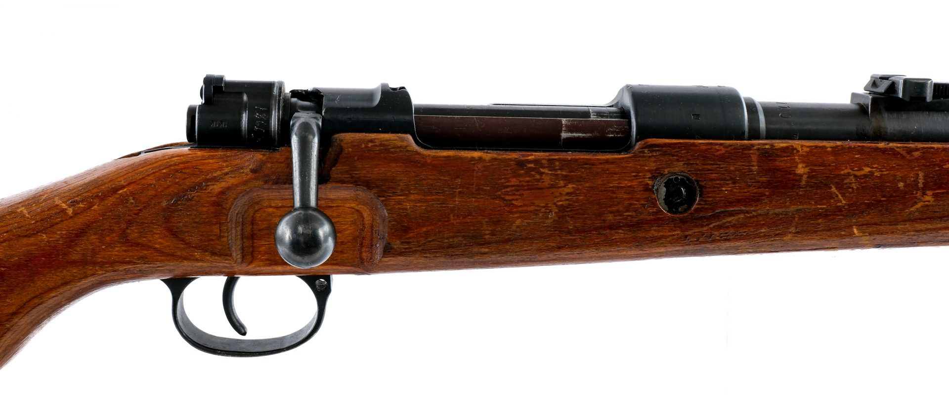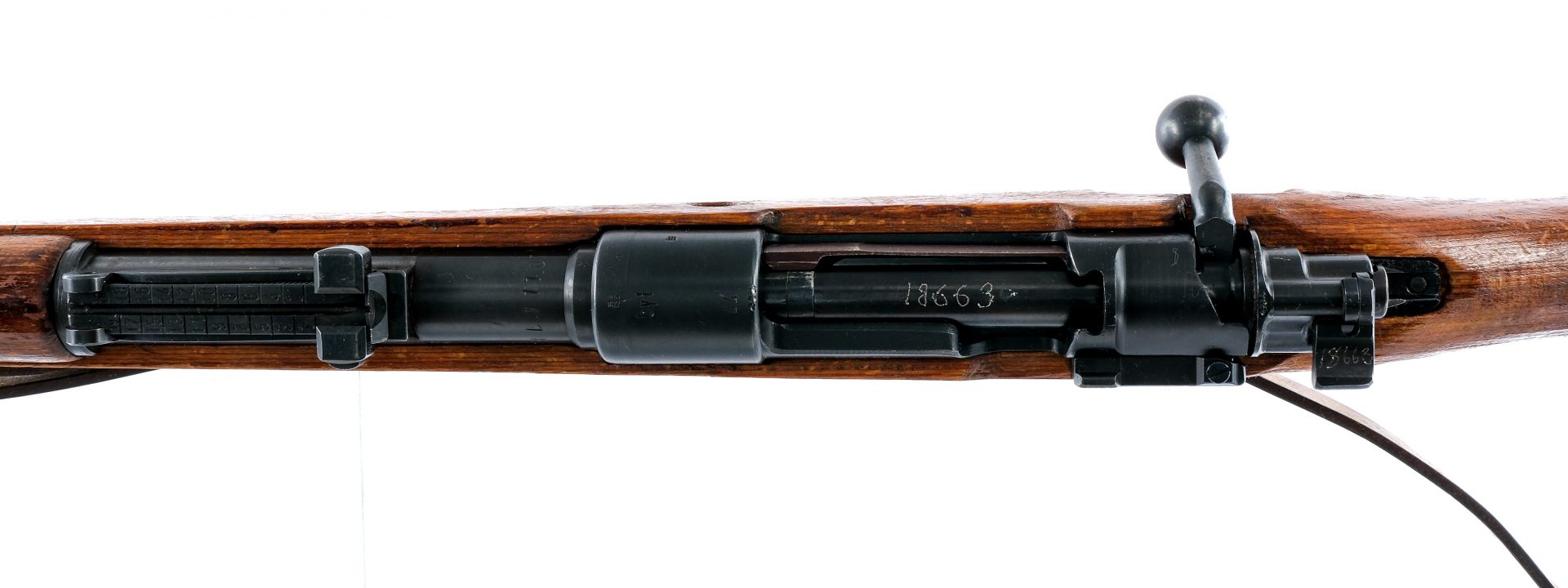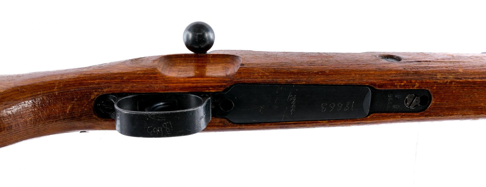 Description Mauser Obendorf (byf) K98 in 7.92x57mm (8mm) with a five round capacity and a 24″ barrel. Made in Germany. Import marked on the muzzle end of barrel by C.A.I. ST ALB VT. Blued butt plate. Smooth laminated wood stock and front forend. Blued trigger guard, trigger, receiver, bolt and barrel. Rear bolt safety switch. Rear left side of receiver bolt release. Rear flip up adjustable and front fixed blade sight. Inlaid into stock bolt/firing pin disassembly disk. Mounted with a unbranded leather shoulder sling. Top of receiver dated to 1944. Left side of barrel and receiver have German Third Reich Eagle. Forced matched serial number to receiver on the bolt, magazine floor plate, trigger guard and wood stock. Must ship to a C&R or FFL holder. Condition: Good with scratches, wood dings, refinished parts and handling wear. Clean rifled bore. Barrel Length: 24″ Serial: 18663C Manufacturer: Mauser Year: 1944 Caliber: 8mm Model: K98 Book# 05493