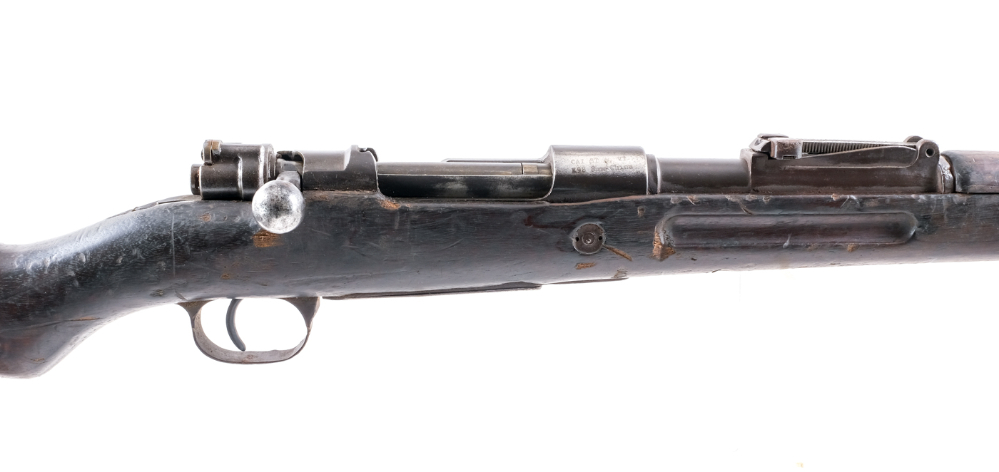 Description Mauser Model 98 in 8mm with a five round capacity and a 24″ barrel. Import marked on the receiver: CAI ST A VT K98 8MM CHINA. Metal butt plate. Smooth wood stock and front forend. Blued trigger guard, untextured trigger, receiver, bolt and barrel. Rear bolt safety switch. Left side of receiver located bolt release. Rear flip up adjustable and front fixed blade sight. Under barrel fixed bayonet lug. Metal loops for mounting a shoulder sling. Metal eyelet in stock for taking apart the bolt. Matching serial number on receiver and barrel. Nazi Swastika on the magazine floor plate and on the underside of rear sight. Mismatched serial on bolt. Must ship to a C&R or FFL holder. Condition: Fair with heavy scratches, wood damage and light rust. Missing the cleaning rod. The rifled bore has rust with visible rifling. Barrel Length: 24″ Serial: A03294 Manufacturer: Mauser Caliber: 8mm Model: K98 Book# 7-605