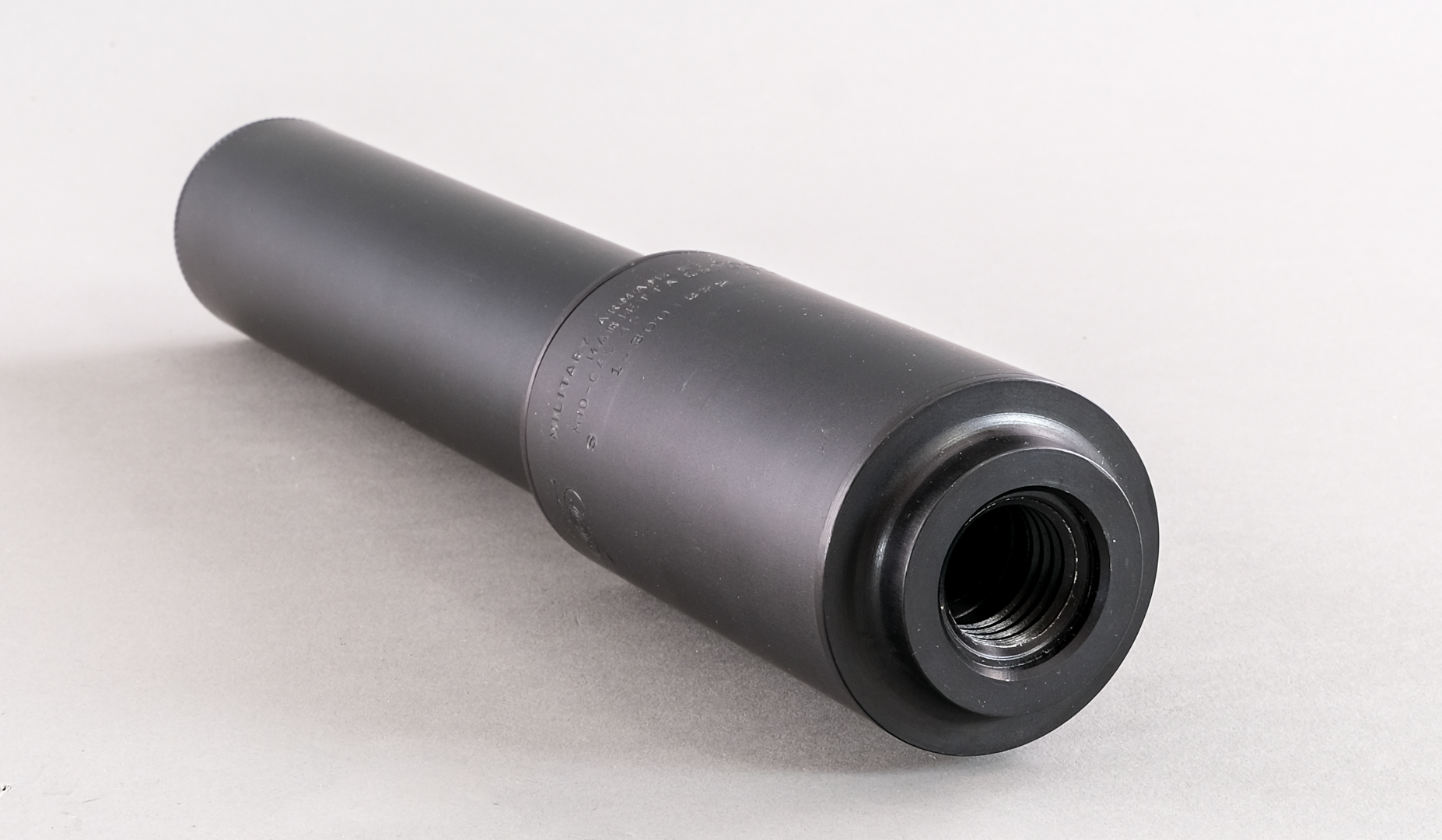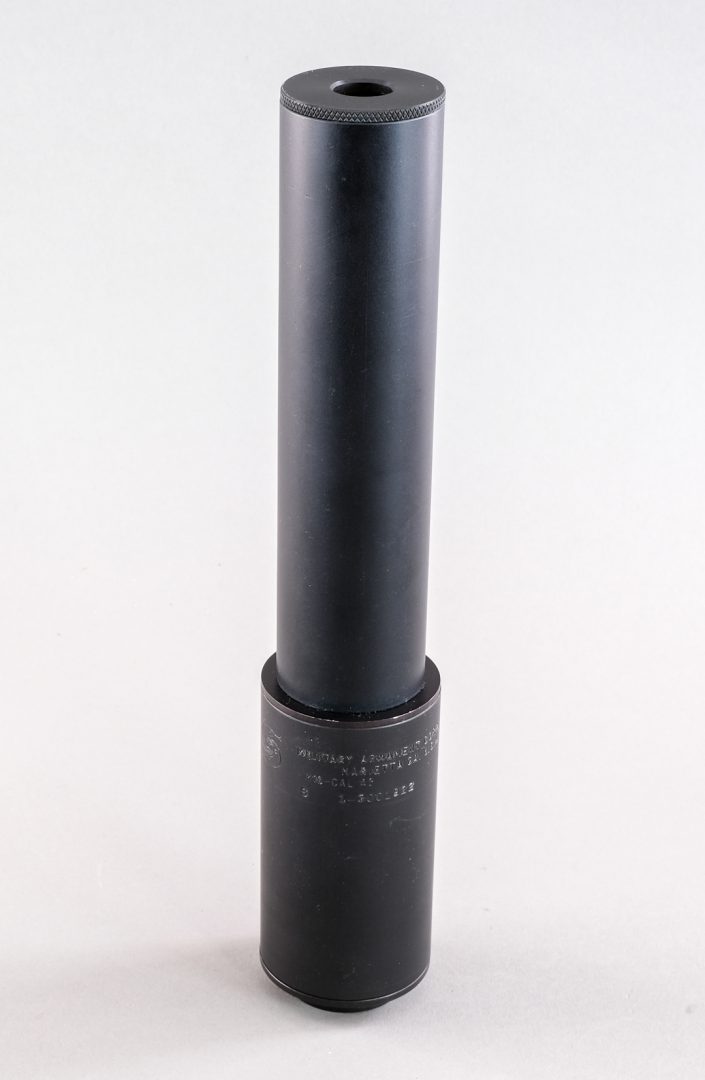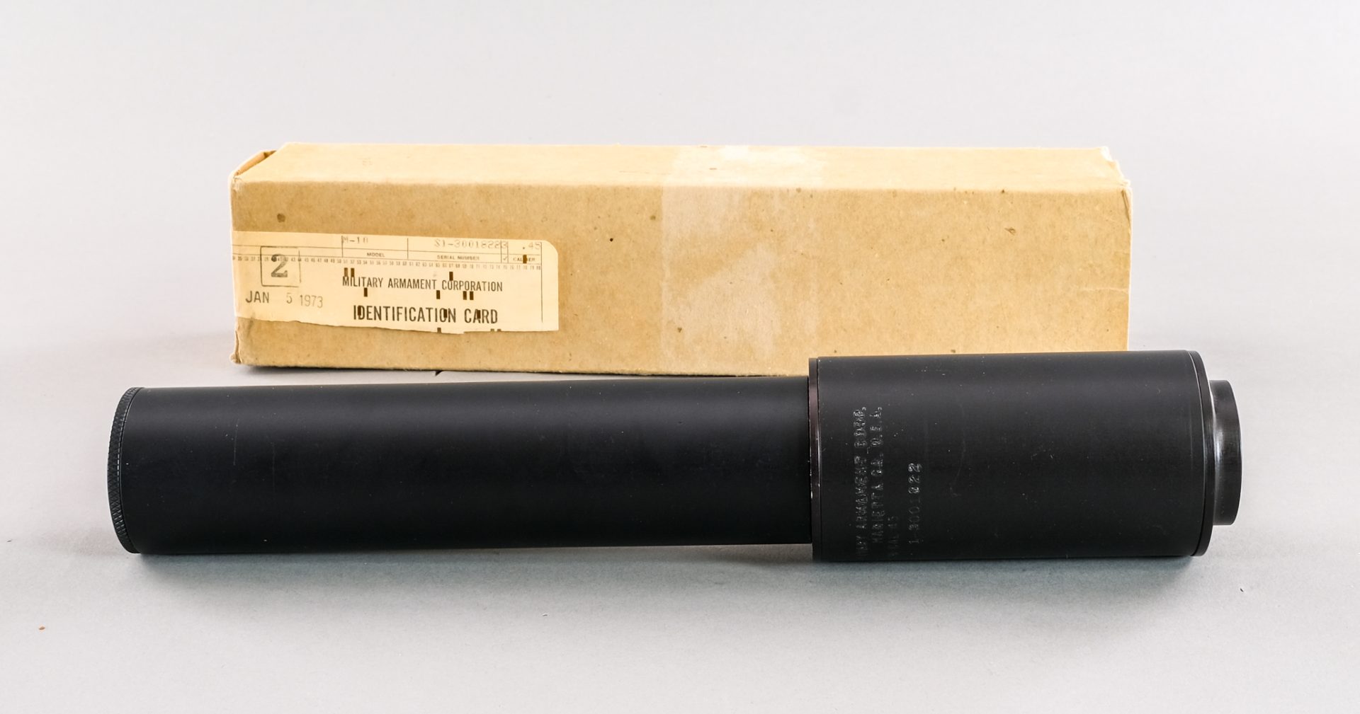 Description Military Armament Corporation M-10 “Mac Ten” silencer with mirage cover. Blued metal with removable front baffle cover. Comes in its factory box with matching serial number and identification card marked Jan 5 1973. Must ship to a FFL holder. NFA Weapon, Ready to ship to your dealer for transfer. Needs a Form 3 and 200.00 tax stamp. Condition: Like new with light handling wear. Clean bore. Barrel Length: 11.5″ Serial: S 1-3001822 Manufacturer: Military Armament Corp Caliber: .45 Model: M-10 Book# NFA 45