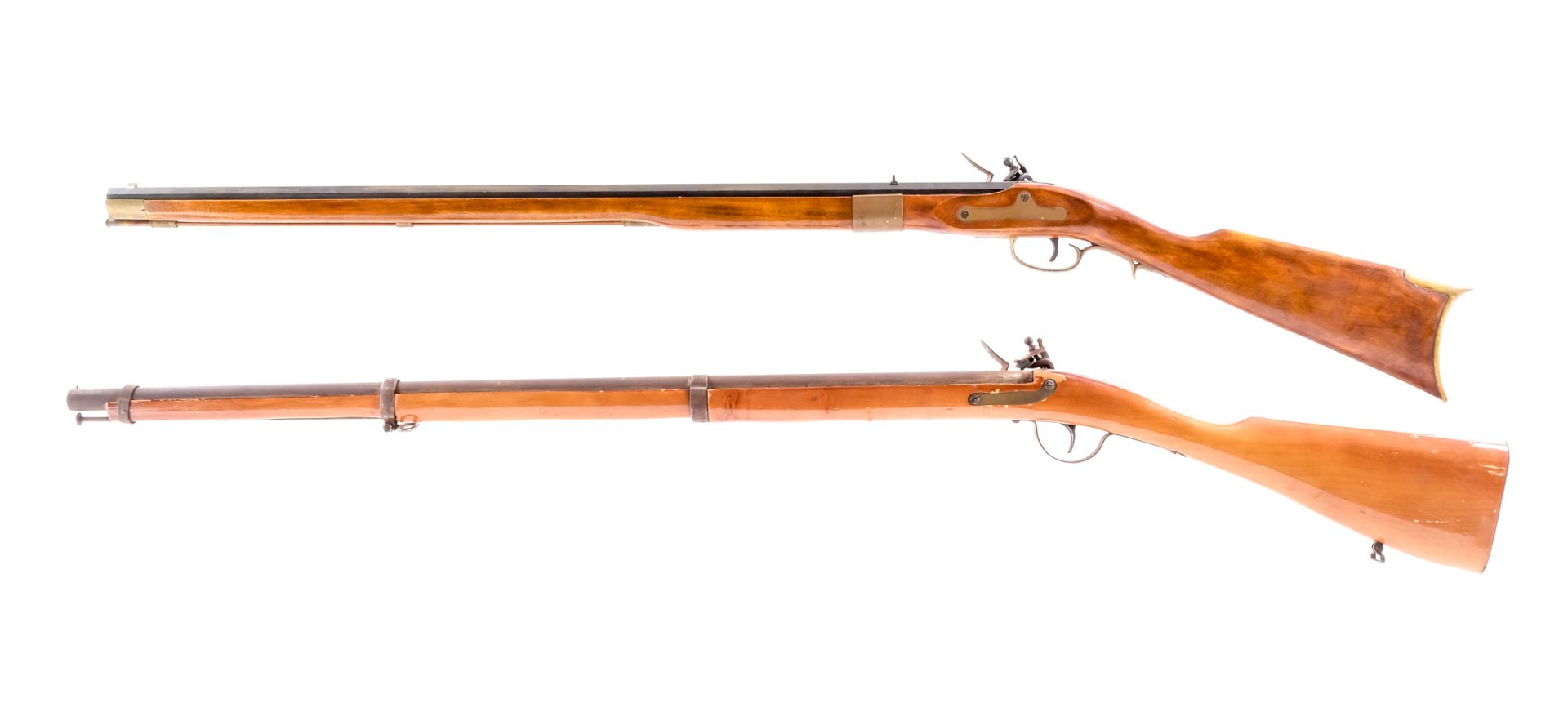 Description This lot is for two black powder flintlock muzzleloaders. The first is a Miroku Japan Ultra Hi in .45 caliber with a single round capacity and a 33.5″ octagonal barrel. Brass butt plate, trigger guard and barrel bands. Case colored smooth trigger, lock plate, hammer and frizzen. Under barrel wooden and brass push/cleaning rod. Rear fixed and front brass blade sight. The second is a Belgian made Centaure Liege measuring in at 16mm at the bore with a 35″ smooth bore. Metal butt plate and trigger guard. Smooth unfinished trigger, hammer, lock plate and frizzen. Under barrel push/cleaning rod. Front brass bead fixed sight. Metal loops for mounting a shoulder sling. They both have a piece of flint in the hammer. Black Powder flintlock muzzle loaders, No FFL required and ships to buyers home. Condition: Good/Very good with light scratches and metal oxidation. The Belgian smooth bore has a small crack in the stock on the left side where the metal meets the wood. The Miroku has a clean rifled bore and the Belgian has a light grain smooth bore. Barrel Length: 35″ 33.5″ Serial: 452 6634 Manufacturer: Miroku Japan Ultra Hi Bel Caliber: 45 Model: Ultra Hi Centaure