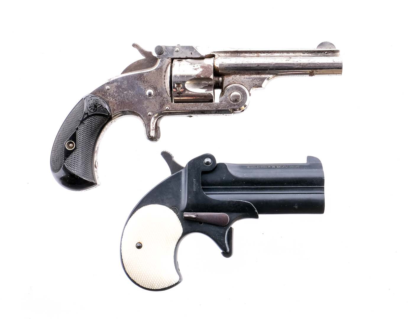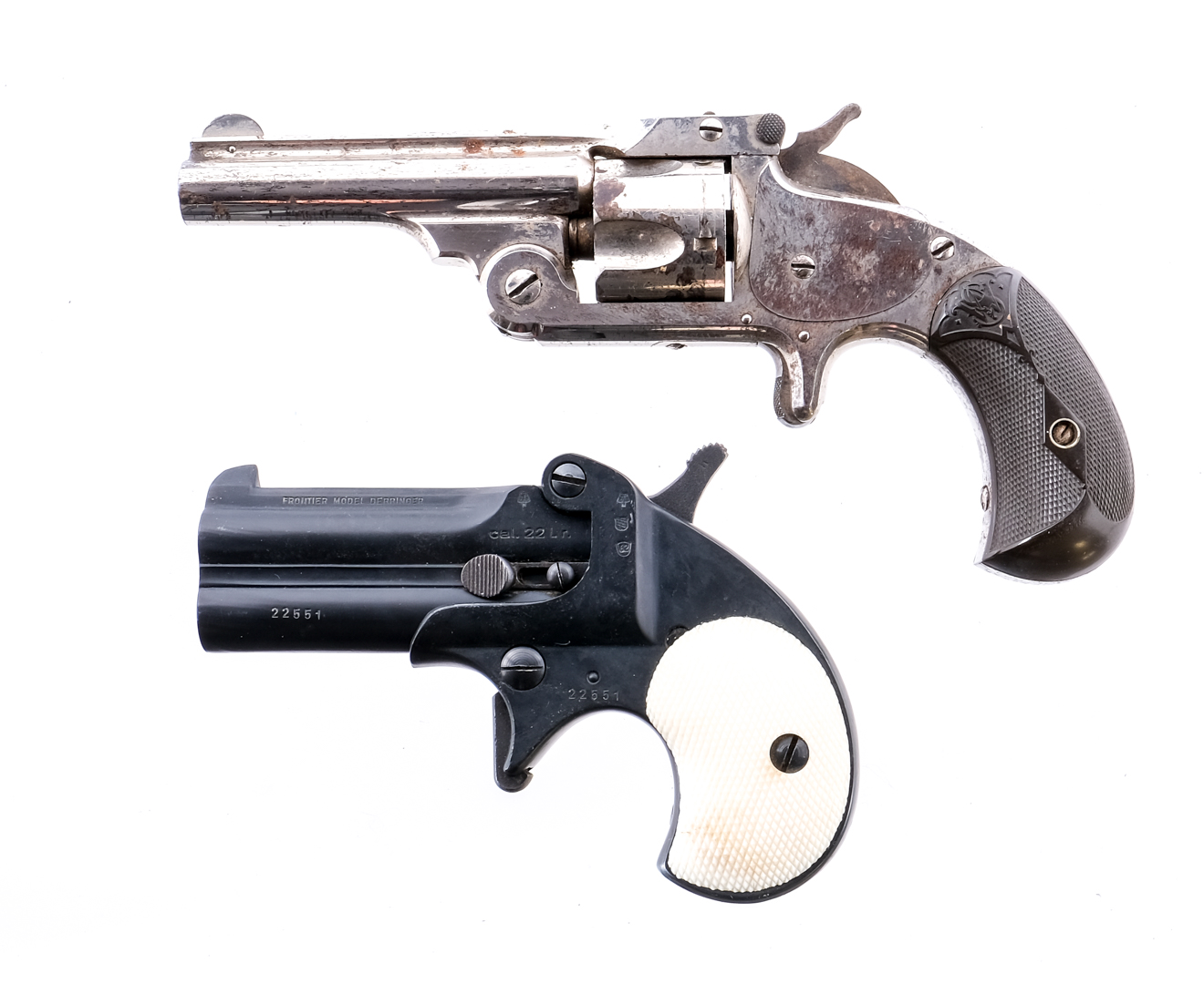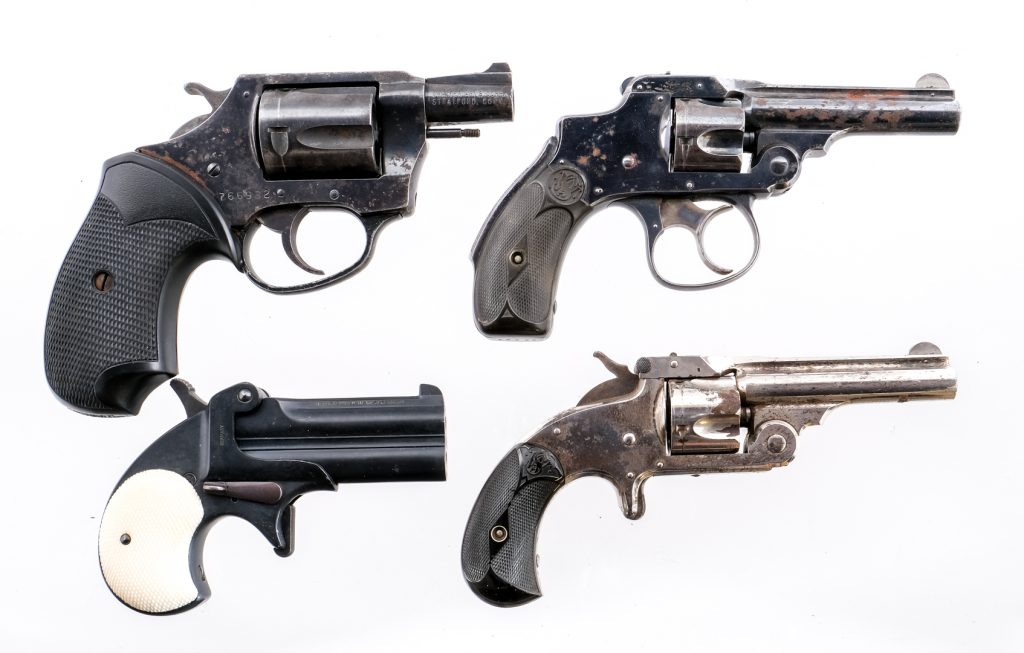 Description This lot is for four Estate found pistols and revolvers. Smith & Wesson Model One and a Half Single Action in .32 Smith & Wesson with a five round capacity and a 3″ barrel. HY Hunter Inc Frontier Derringer in .22 Long Rifle with a two round capacity and a 3″ over under barrel. Made in Germany. Smith & Wesson 32 Safety Hammerless 1st Model in .32 Smith & Wesson with a five round capacity and a 3″ barrel. Charter Arms Undercover in .38 Special with a five round capacity and a 2″ barrel. The S&W 1.5 Single Action is Antique and ships to buyers home No FFL required. The S&W safety hammerless in .32 ships to a C&R or FFL holder. The Charter Arms ships to a FFL holder. The HY Hunter ships to a C&R or FFL holder. Condition: Poor with scratches, non-function and rust. The bore on the Derringer is clean. The three other have rust. Sold AS-IS. Barrel Length: 3″ 3″ 3″ 2″ Serial: 55022 22551 766932 38097 Manufacturer: Charter Arms S&W HY Hunte Caliber: .22 LR .32 S&W .38 Spl Model: Frontier Derringer 1.5 Undercover Safety Book# X-194-191-200