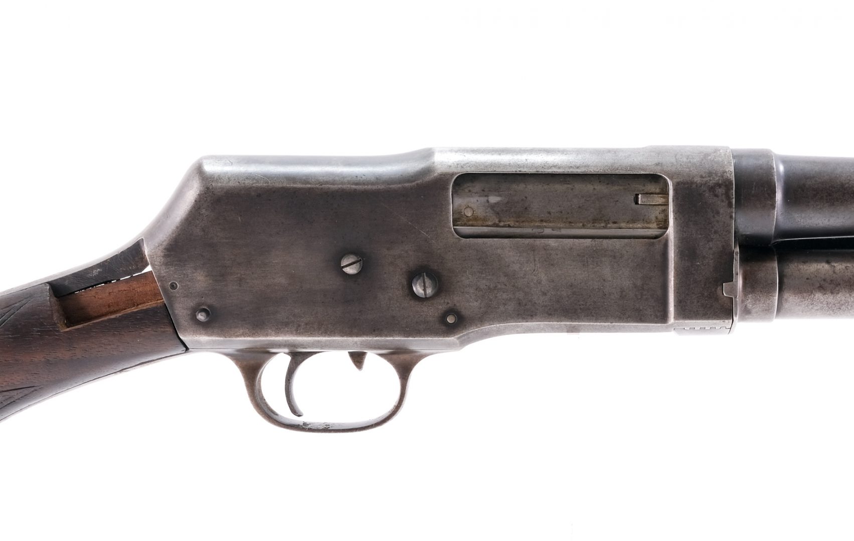 Condition: Good with moderate wear, scuffs and small scratches. Butt stock has a missing piece on the upper right and left side. Foregrip has a small crack on the right side. Heavy finish loss, scuffs and scratches throughout barrel and receiver with touches of metal oxidation. Receiver tang has a aftermarket brass screw in place of the original. Very clean smooth bore and crisp trigger pull.